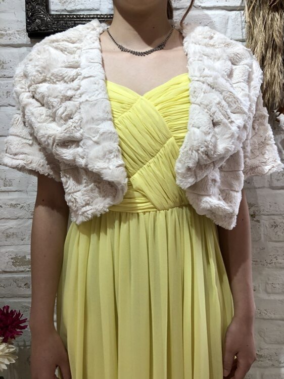 羽織るだけで華やかな雰囲気になるふわふわな毛足のフェイクファーボレロ。どんなカラーのドレスにもあわせやすいオフホワイトカラー。リアルファーのようななめらかで柔らかい触り心地です。カジュアルめにもきれいめにもあわせやすいデザインです。クリスマスパーティーや謝恩会、成人式、お食事会、女子会など秋冬の華やかなパーティシーンにおすすめです。サイズは目安になりますので必ず表記している実寸サイズをご確認ください。