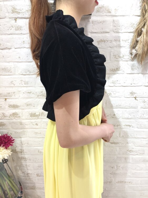 ベロア素材のブラックボレロです。秋冬におすすめのベロア素材。フリルでふちどられていて華やかさもプラス。パフスリーブで二の腕をほっそりと見せてくれる効果も期待できます。結婚式参列、各種パーティ、お呼ばれ、お食事会など様々なシーンにプラスして頂ける商品です。サイズは目安になりますので必ず表記している実寸サイズをご確認ください。