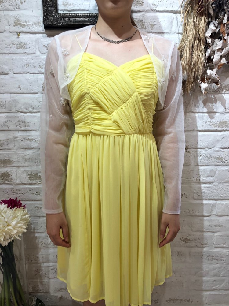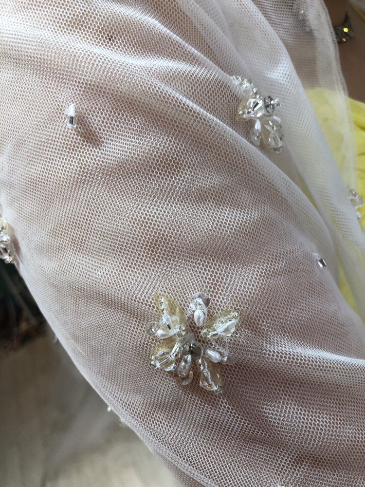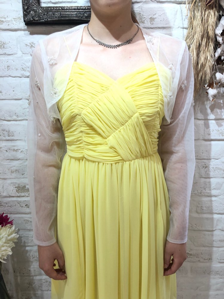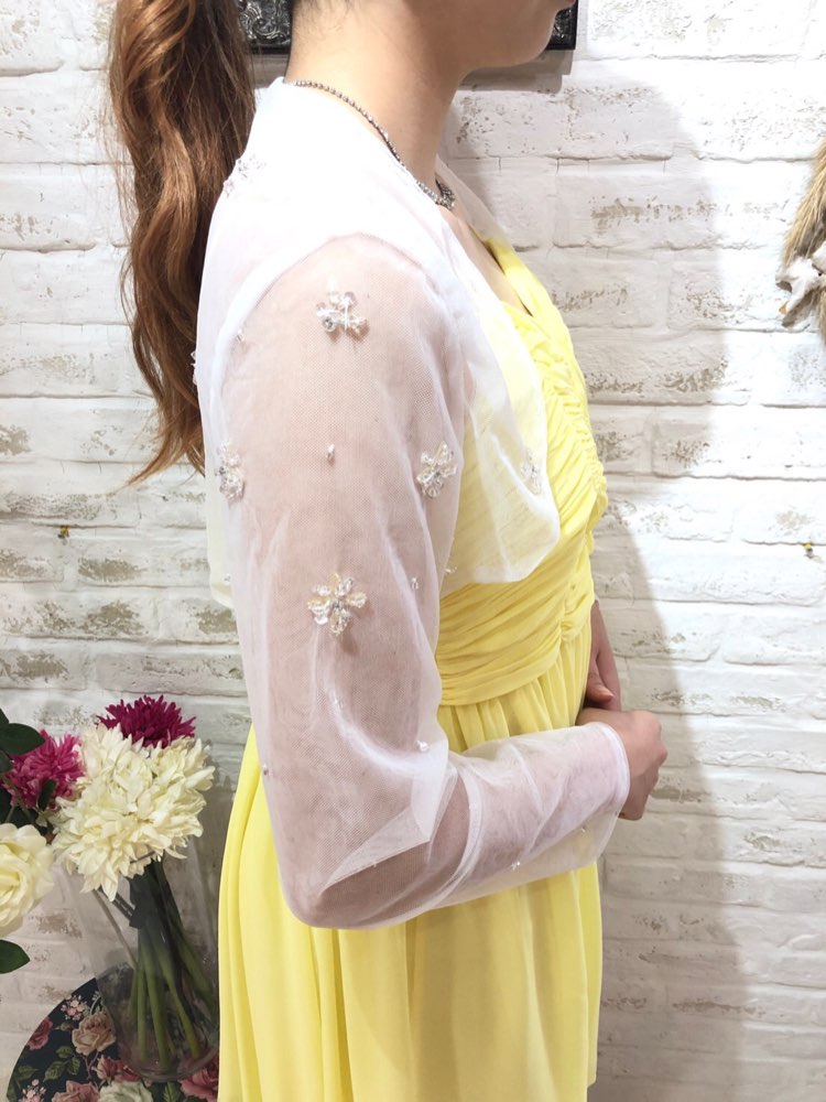 ホワイトの長袖チュール素材のボレロ。シースルーで透け感がありますので長袖ですがコーディネートが重くなりません。クリアビーズとスパンコール、パールで形どったお花モチーフのビジュー付き。華やかさも与えてくれます。少しハリ感のある素材になりますのできちんと感も出してくれる1点です。腕を露出したくない花嫁様にもおすすめです。M~L相当にサイズ感になります。サイズは目安になりますので必ず表記している実寸サイズをご確認ください。