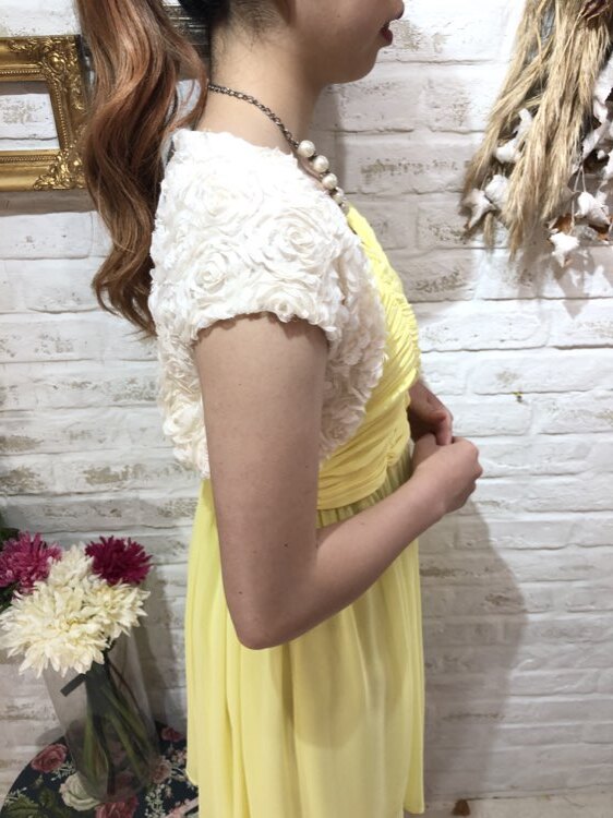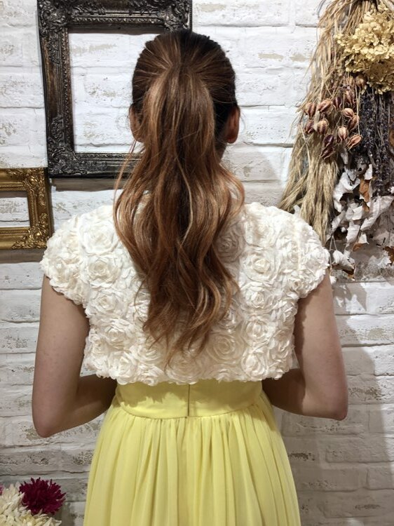 花びら風のショート丈ボレロです。どんなカラーのドレスにもあわせやすいアイボリー系カラー。シンプルですが全体に花びら風のフリルが施されているので可愛らしく華やかな印象になります。ショート丈でスタイルアップも狙える1着です。フリル生地に若干の毛羽立ちがあります。結婚式参列、各種パーティ、お呼ばれ、お食事会など様々なシーンにプラスして頂ける商品です。サイズは目安になりますので必ず表記している実寸サイズをご確認ください。