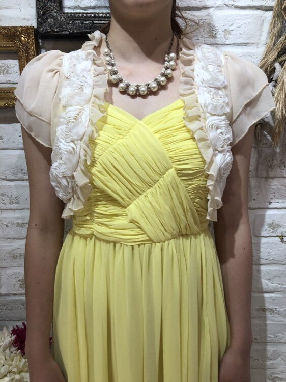 バラ風のフリルが可愛らしいアイボリーベージュのボレロです。フリルがお顔周りを華やかに演出してくれます。アイボリーカラーはどんな色のドレスにもあわせやすいカラーになります。生地はしっかりとしていますが厚くないので1年中着用できるアイテムとなっております。結婚式参列、各種パーティ、お呼ばれ、お食事会など様々なシーンにプラスして頂ける商品です。サイズは目安になりますので必ず表記している実寸サイズをご確認ください。