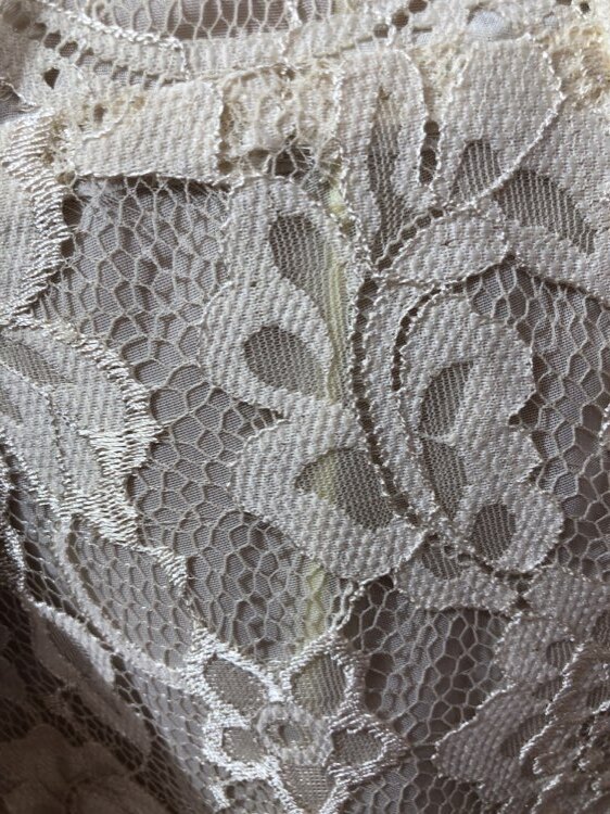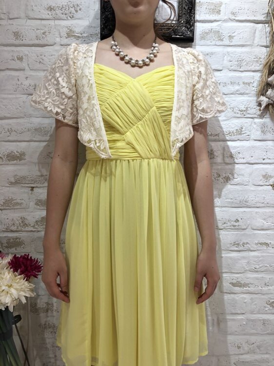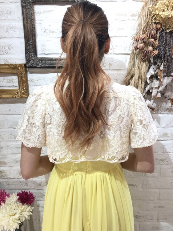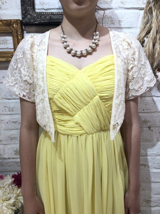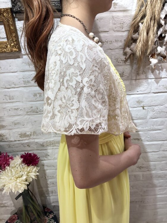 総レースのアイボリーカラーボレロです。レースが華やかさを与えてくれる1点です。1年を通して着用して頂けますが、やや生地が薄手になりますので真夏でも着用しやすいものとなります。比較的綺麗な状態ですが、数回のクリーニングによる生地のゆがみで正面下部の生地が若干外側に開き気味になっております。ご了承下さい。結婚式参列、各種パーティ、お呼ばれなど様々なシーンにプラスして頂ける商品です。サイズは目安になりますので必ず表記している実寸サイズをご確認ください。