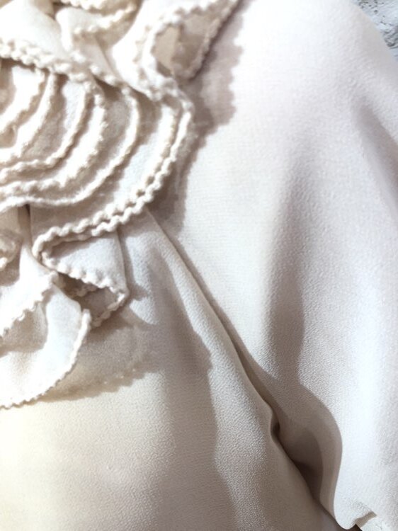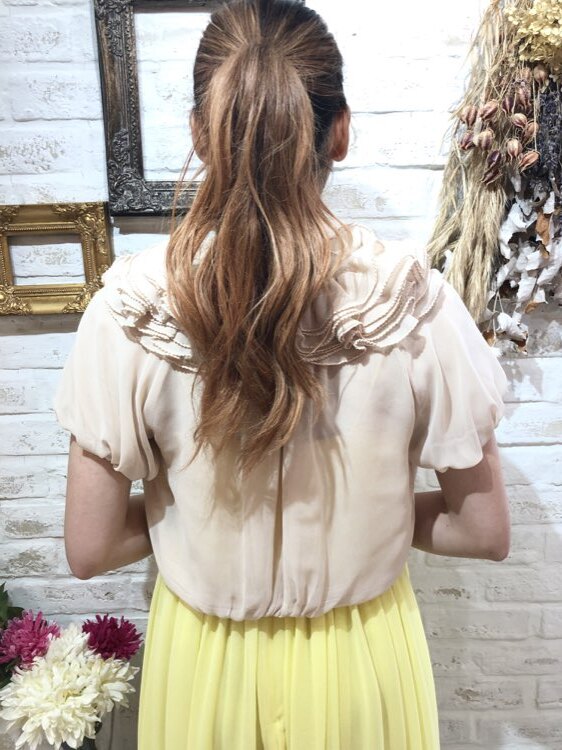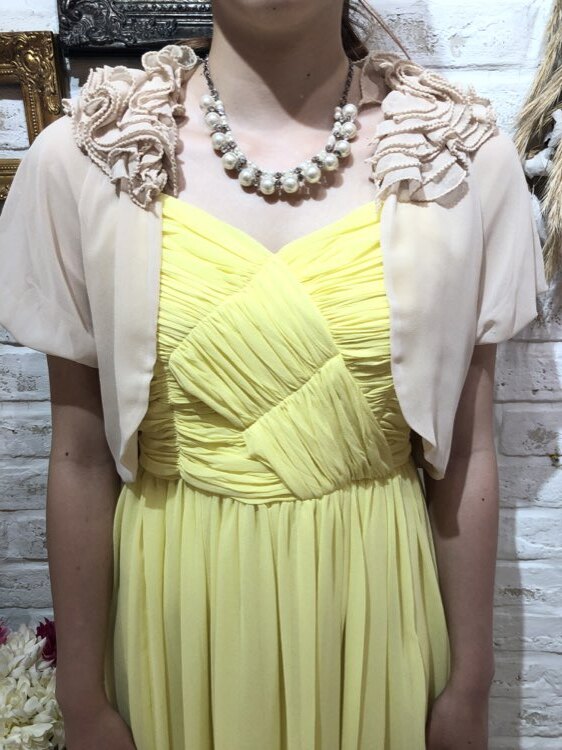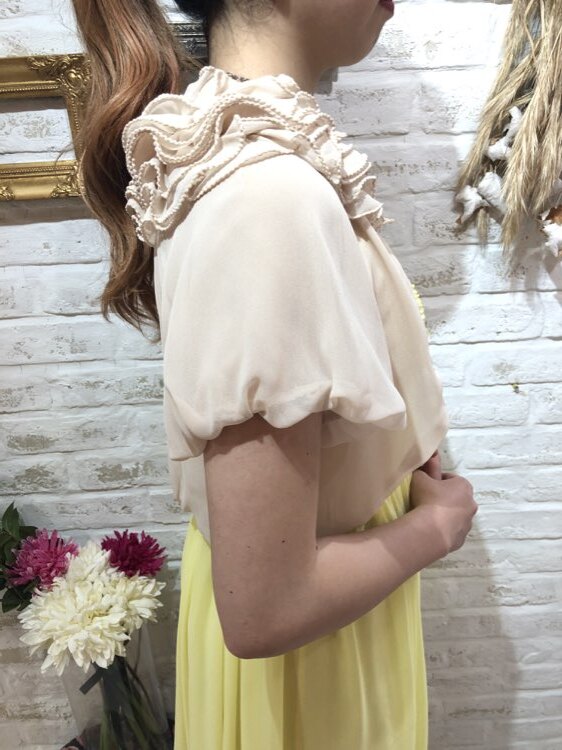 首回りにボリュームのあるフリルがついたベージュボレロです。落ち着いた着丈、カラーなので40代50代の方にもおすすめです。首回りが華やかなのでネックレスをつけなくても顔周りを華やかに演出してくれます。ネックレスが苦手な方、金属アレルギーの方などにもおすすめの1点です。結婚式参列、各種パーティ、お呼ばれなど様々なシーンにプラスして頂ける商品です。サイズは目安になりますので必ず表記している実寸サイズをご確認ください。