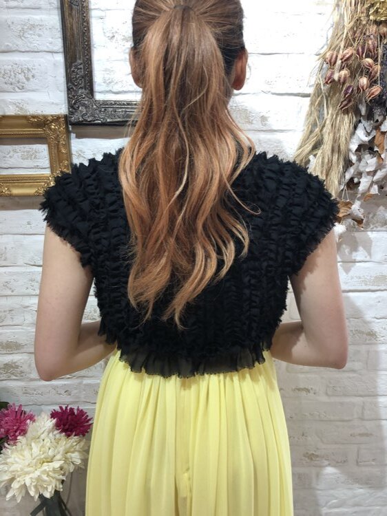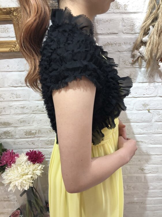フリルが華やかなブラックボレロです。当店では比較的長めの着丈となっております、お袖は半袖とフレンチスリーブの中間程度の長さでタイトめではないのでふんわりと二の腕をカバーしてくれます。定番カラーのブラックは淡いカラーのコーディネートを引き締めてくれる効果も。上半身をすっきり見せたい方におすすめの1点です。またフリルは可愛らしいイメージがありますがブラックだと甘すぎない大人コーディネートにも活用できます。結婚式参列、各種パーティ、お呼ばれなど様々なシーンにプラスして頂ける商品です。サイズは目安になりますので必ず表記している実寸サイズをご確認ください。