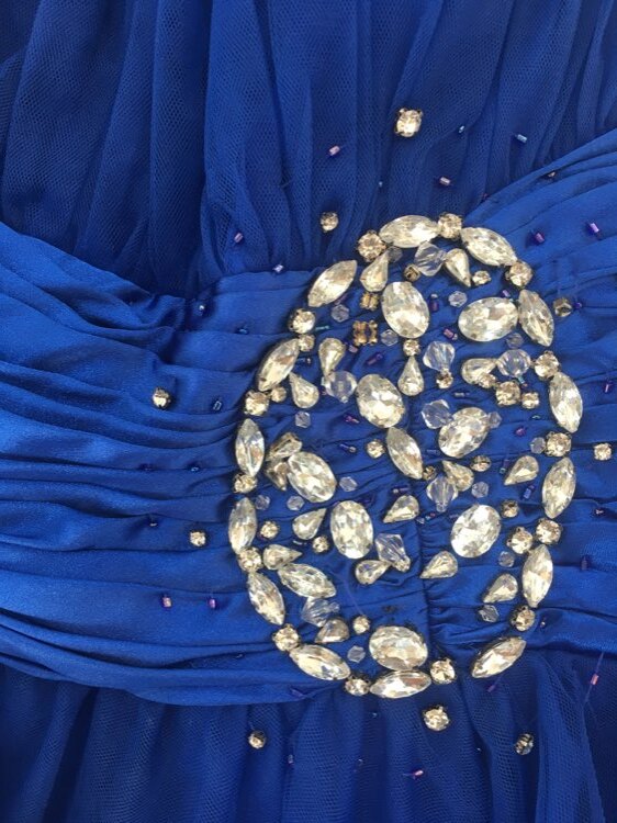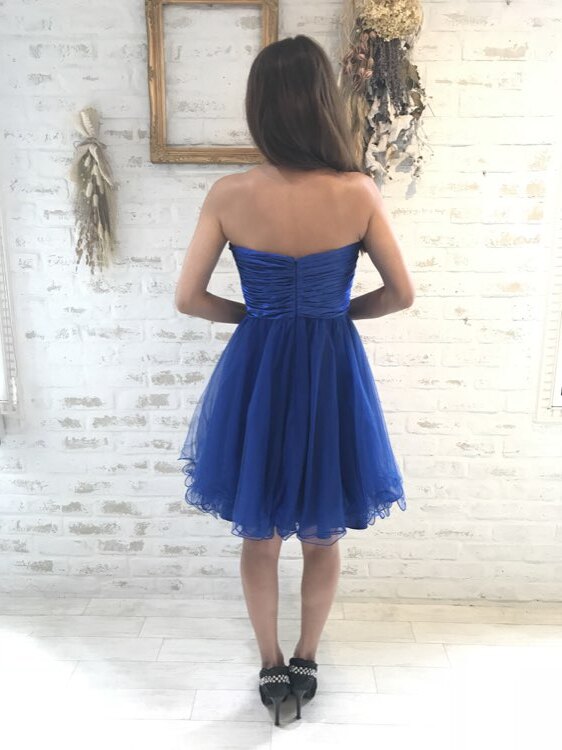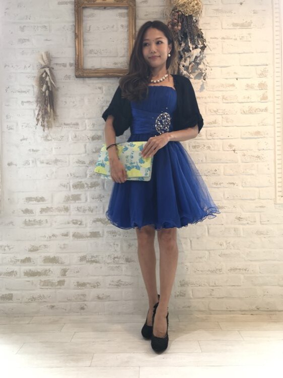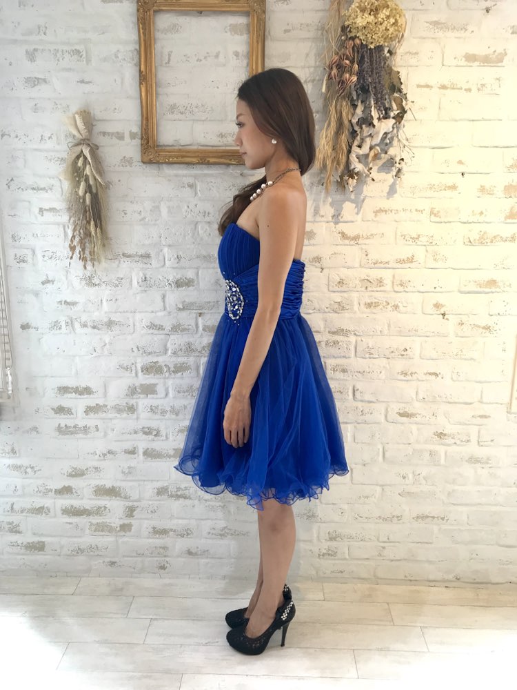 ロイヤルブルーカラーがきれいなチュールスカートベアドレスです。ウエストラインに大き目のビジューがついており、とっても華やかな雰囲気。パーティーや謝恩会などにおすすめの1着です。またバスト下にラインがくるので脚長効果も期待できそう。チュールスカートはほどよくボリュームがあり、ふんわりとした形。丈は短すぎないので安心です。可愛らしいデザインが苦手な方もロイヤルブルーなので是非トライしてみては?!大人の方もティーンの方にもオススメの店舗でも人気のドレスです。状態も比較的良好。※透明ストラップをつけることも可能です。