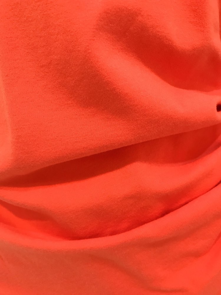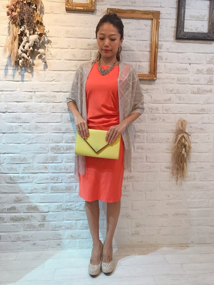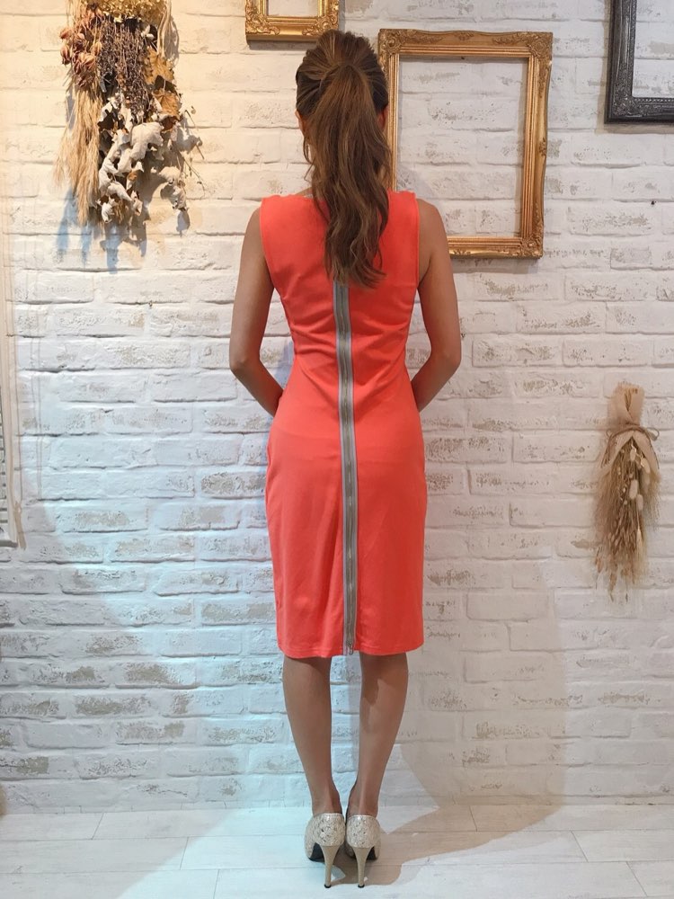 オレンジカラーのタイトドレスです。正面はシンプルなデザインながらもバックスタイルは裾まで入ったファスナーが個性的な1着です。ややストレッチが入っていますのでタイトめなデザインですが着心地も◎。 シンプルでクール系の雰囲気がお好きな方におすすめドレスです。お食事会や各種パーティー、謝恩会などにおすすめの1着です。結婚式参列などお呼ばれシーンにはボレロやストールなどを羽織ると露出もおさえられて◎です!
