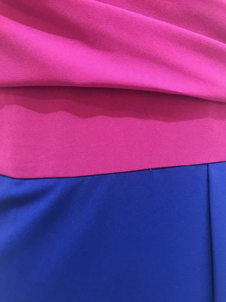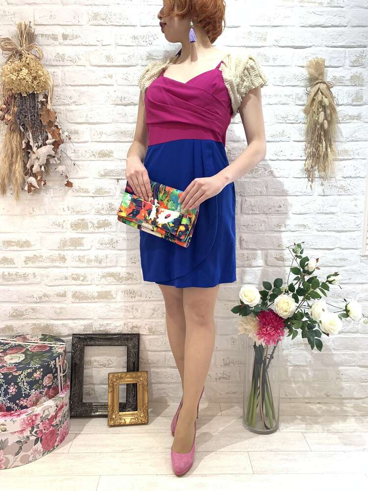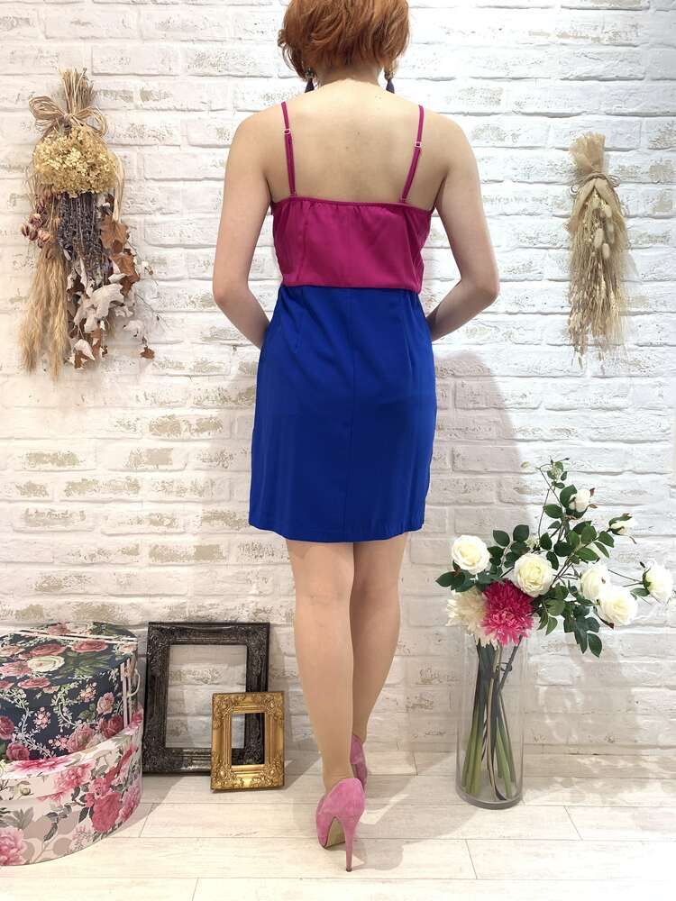 ハイセンスなマゼンタピンク×ブルーカラーのバイカラードレスです。ストラップ付き。大胆な配色がまわりと差をつけてくれること間違い無しの1着です。形はシンプルなシルエット。タイトめなシルエットがクールな印象です。バストのハートカットラインがお顔周りをすっきりと見せてくれます。大きめのネックレスとも相性◎ お食事会や各種パーティー、謝恩会などにおすすめ。お呼ばれシーンにはボレロやストールなどを羽織ると露出もおさえられて◎です!(調節可能なストラップの為着丈サイズは最短~最長で記載しています)