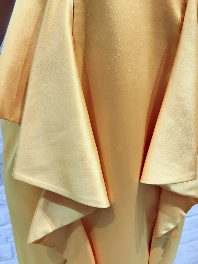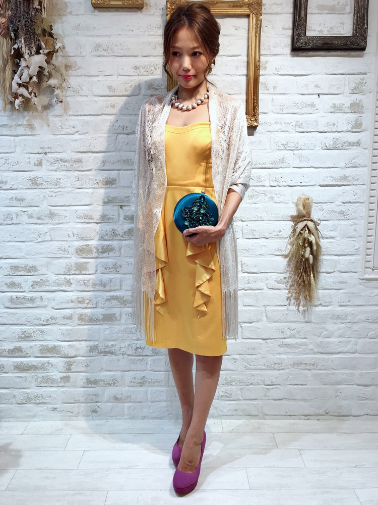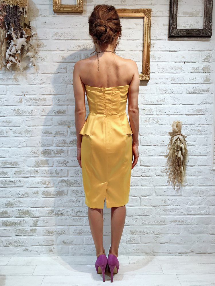 イエローカラーが華やかなサテン地ベアドレスです。ウエストにひだが付いたようなペプラム風のタイトドレス。ウエストを強調し、身体にメリハリをつけてくれる効果があります。比較的露出が髙いベアドレスですが、イエローカラーで健康的なイメージを与えてくれます。やや光沢のある素材です。お食事会や各種パーティー、謝恩会などにおすすめの1着です。結婚式参列などお呼ばれシーンにはボレロやストールなどを羽織ると露出もおさえられて◎です!