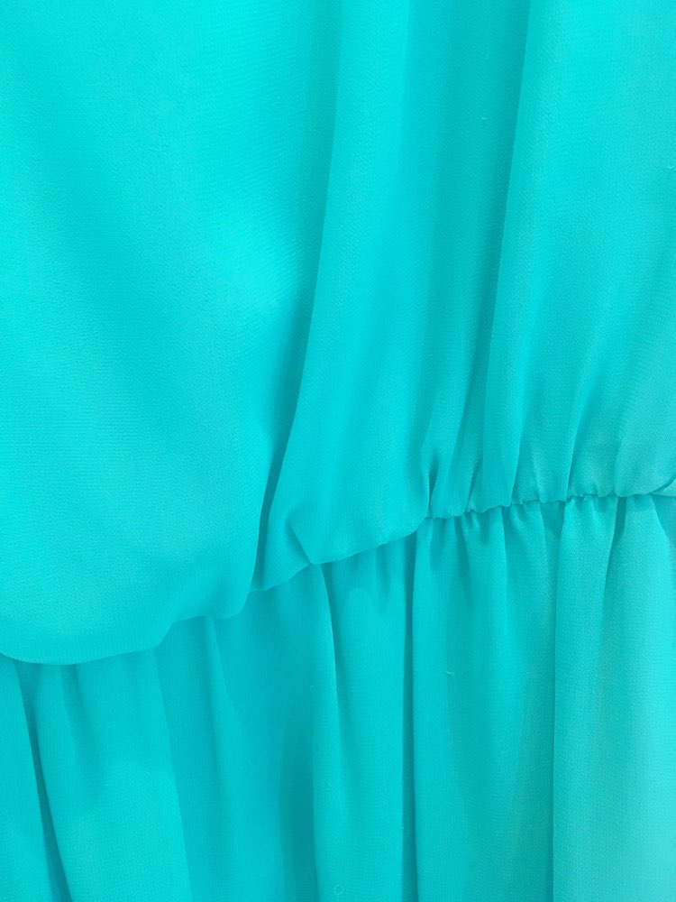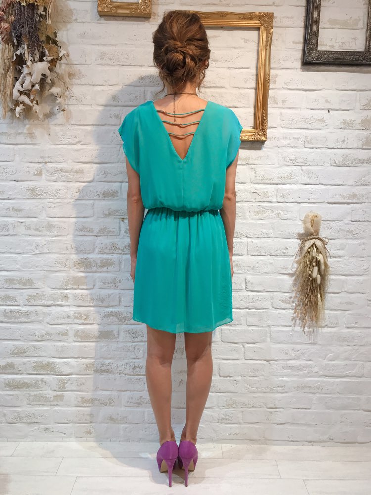 シンプルなグリーンドレスです。正面は究極にシンプルですが後ろの背中部分は深くあいたデザインにコード使いがおしゃれなポイントになっております。お袖はほどよく広がったフレアスリーブで二の腕を細く見せてくれる効果も期待できます。お食事会や各種パーティー、謝恩会などにおすすめの1着です。カジュアルなパーティー、ガーデンパーティなどにもおすすめ。シンプルな分、小物で雰囲気をチェンジできる1着です。大ぶりのネックレスや柄物のバッグ・靴をコーディネートしても素敵です。