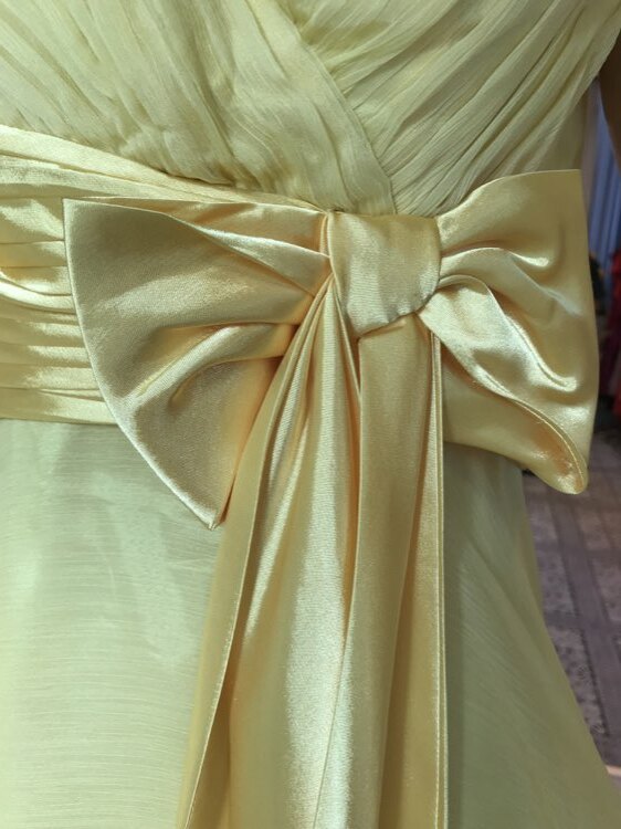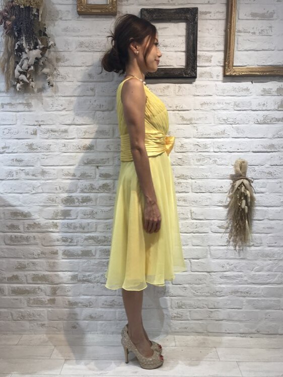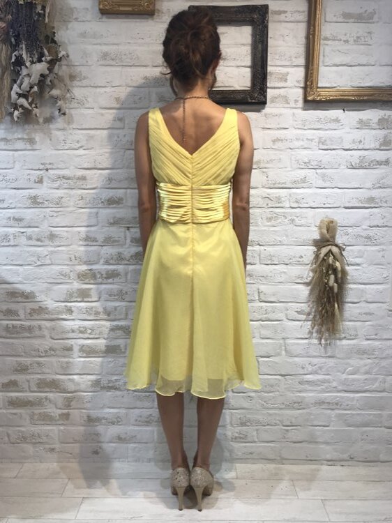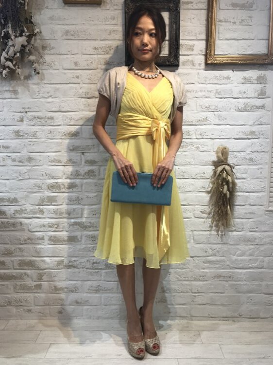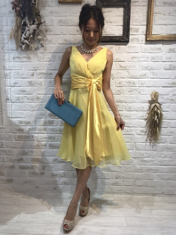 ウエストリボンと膝下の長めのスカート丈が定番人気のドレスです。Vネックで首回りをすっきりと見せてくれますが胸元が気になる方はチューブトップを着用しても◎ シフォン素材のスカートがさらさらと揺れる感じが魅力的な1着です。ウエストの切り替えもスタイルアップを叶えてくれます。明るいイエローは春夏におすすめのカラーです。謝恩会、女子会、各種パーティーなどにおすすめの1着です。結婚式参列などお呼ばれシーンにはボレロやストールなどを羽織ると露出もおさえられて◎です。