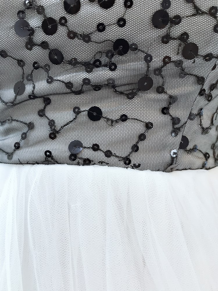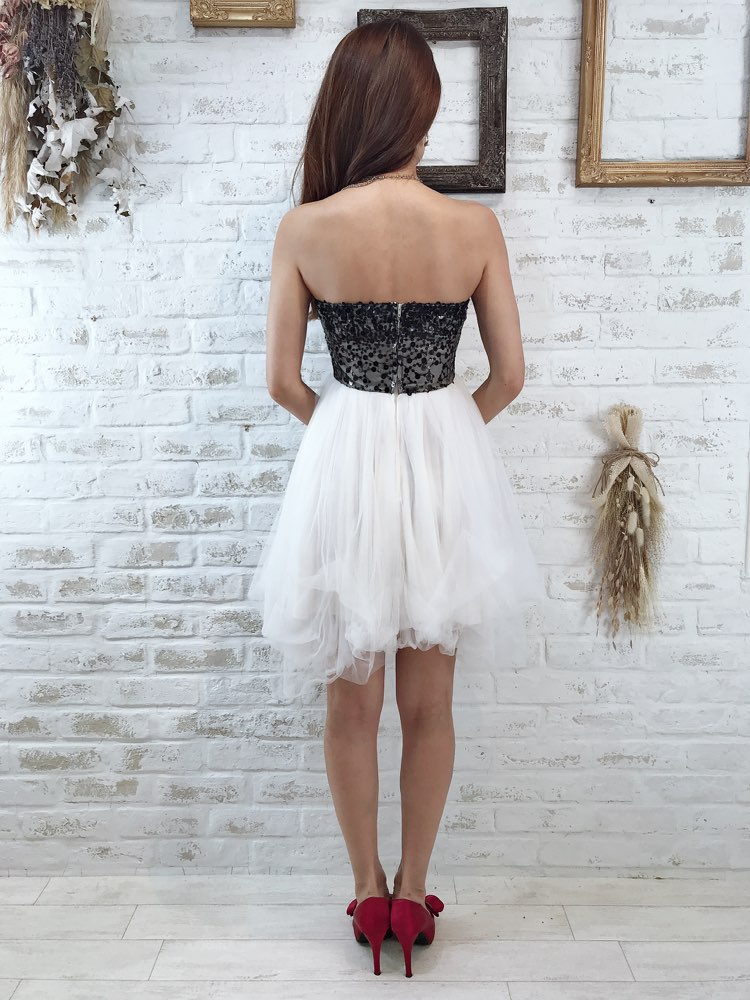 チュールスカートとブラック×ホワイトがおしゃれなバイカラーベアドレスです。ウエストの切り替えが高め可愛らしさと華やかさをプラスしてくれます。ふわっとしたチュールスカートはパニエ着用無しでも充分なボリュームが出ます。スカートの裾は平行なラインではなく、ジグザグとしたラインもポイントです。花嫁様2次会やカジュアルなパーティー、リゾートなどにもおすすめの1着です。謝恩会や女子会、各種パーティーに着用されるならピンクやレッドなど差し色になるカラーをあわせてあげても◎