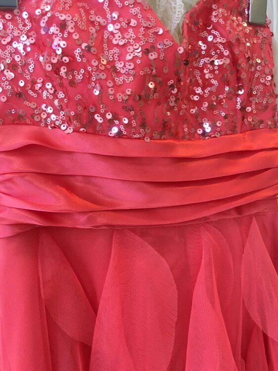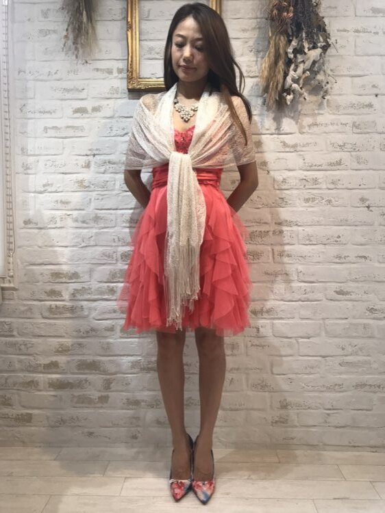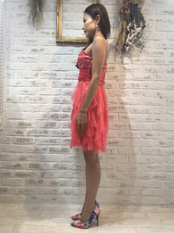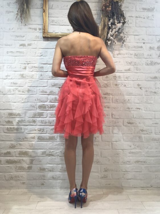 コーラルピンクが鮮やかな華やかさ満点のベアドレスです。上半身部分はスパンコールが輝いており、とてもゴージャスです。チュール素材のフリルスカートはひらひらと可愛らしさを演出してくれます。謝恩会、女子会、各種パーティーにおすすめの1着です。お呼ばれシーンにはボレロやストールなど羽織ると露出もおさえられて◎です。オレンジとピンクの中間くらいのカラーなので可愛いデザインでも甘すぎない雰囲気の1着になります。
