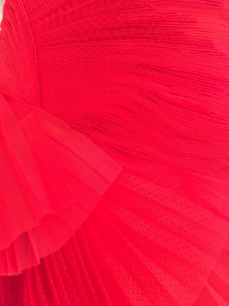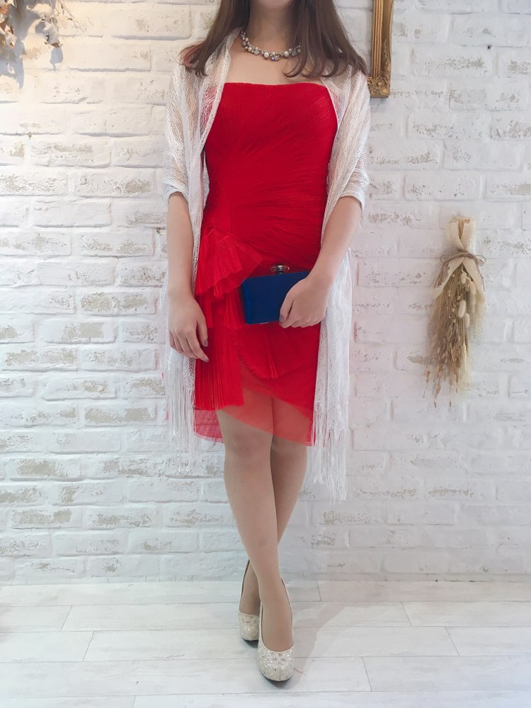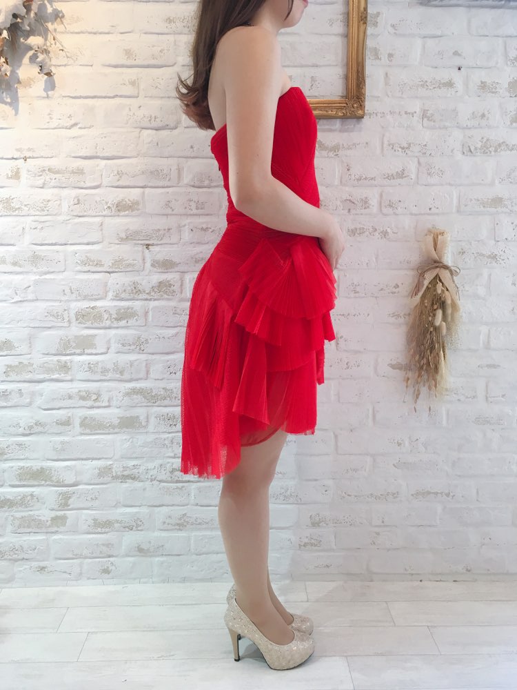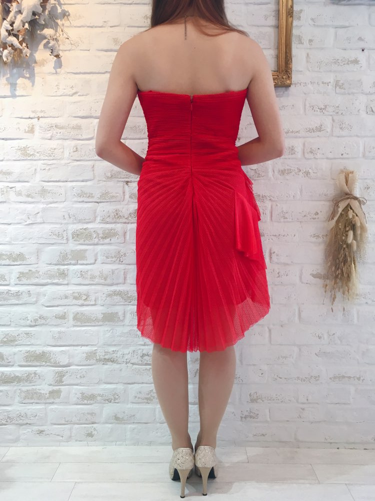 パーティーの主役になれそうな鮮やかなレッドカラーベアドレスです。ウエストから広がるようなたっぷりなプリーツとフリル使いが贅沢な1着。バックはヒップにプリーツが集まるデザインになっておりヒップラインを丸く女性的に美しく見せてくれます。後ろ下がりのスカートも脚を美しく見せてくれる効果有り。胸元は深くカッティングされておらず平行ラインで胸元の露出が気になる方におすすめ。お食事会や各種パーティー、謝恩会などにおすすめの1着です。結婚式参列などお呼ばれシーンにはボレロやストールなどを羽織ると露出もおさえられて◎です!