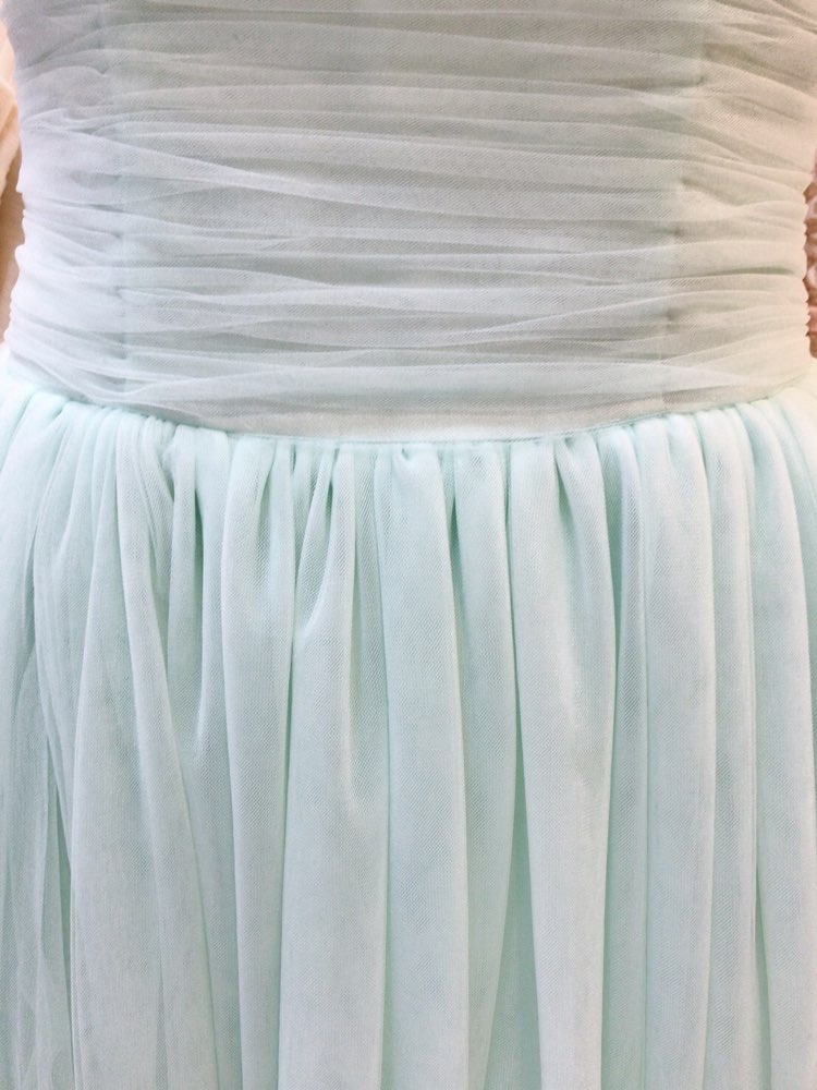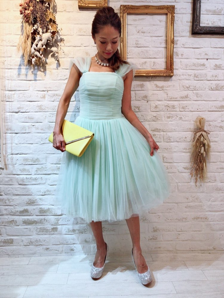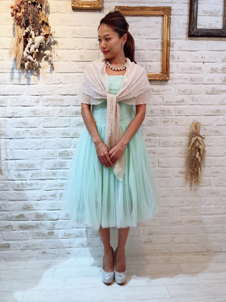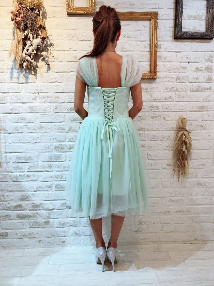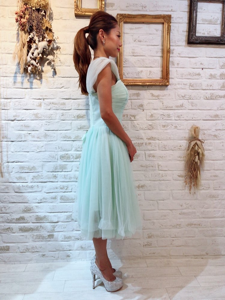 ボリュームのあるチュールスカートが魅力的なミントカラードレスです。背中部分はあみあげでサイズ調節可能。ショルダー部分はやや長めで39㎝の長さになりますので不要でしたらスナップボタンで取り外してベアドレスとしても着用可能です。ショルダー部分、スカート部分はチュール素材、上半身部分はややハリのある素材と異素材のおかげで無地でものっぺりとした感じにはならずにめりはりをつけてくれます。謝恩会、女子会などの他、花嫁様2次会などカジュアルなパーティにもおすすめです。