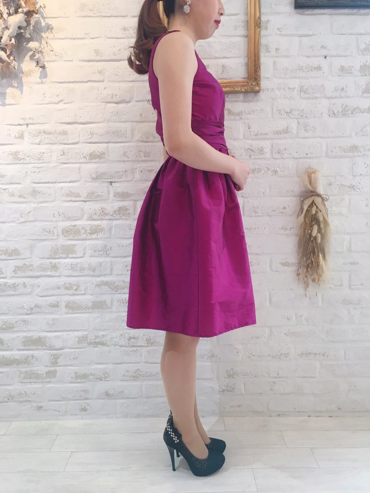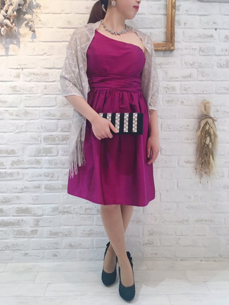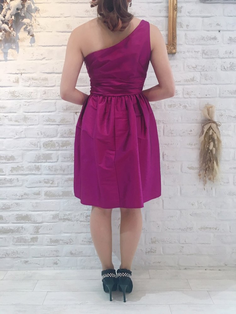 鮮やかなパープルピンクカラーが魅力的なワンショルダードレスです。やや光沢感とハリがある素材でシンプルなデザインながらも華やかなパーティシーンにぴったりな1着。ワンショルダーデザインなのであえてネックレスをつけずに大ぶりのイヤリング・ピアスでコーディネートするのも素敵です。お食事会や各種パーティー、謝恩会などにおすすめの1着です。結婚式参列などお呼ばれシーンにはボレロやストールなどを羽織ると露出もおさえられて◎です!