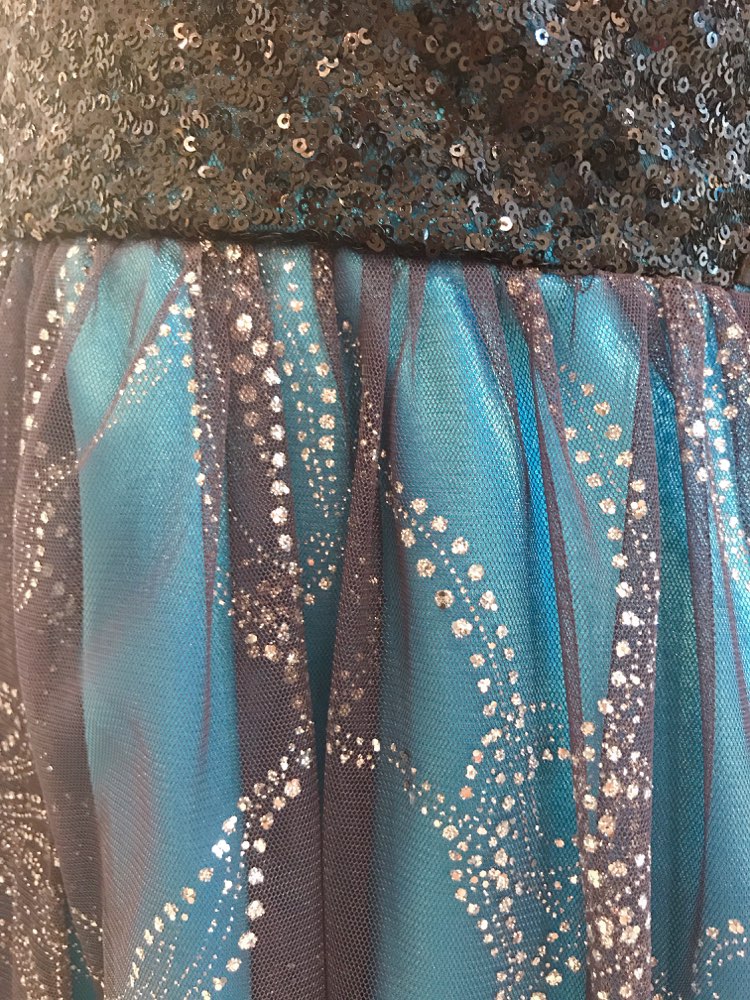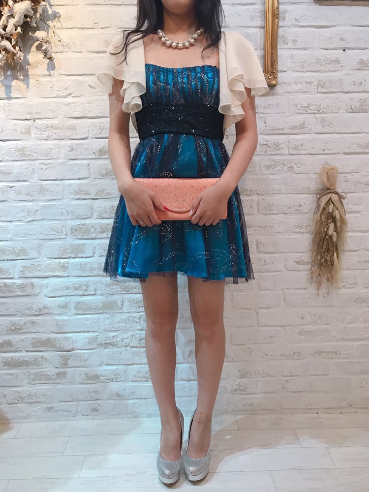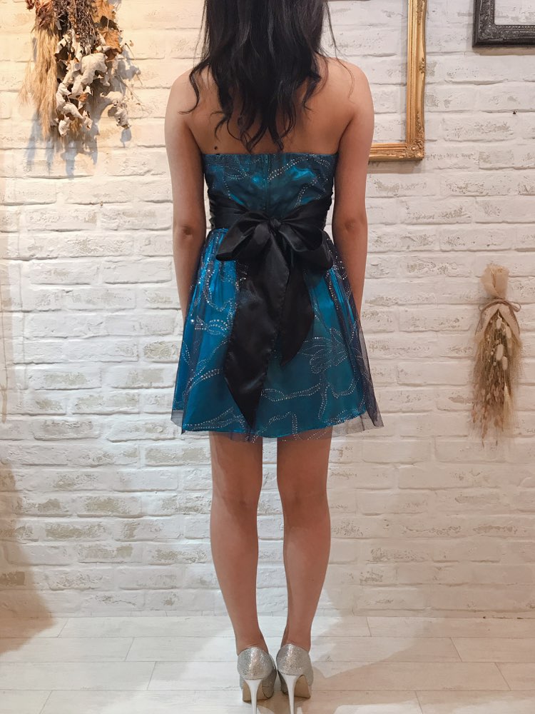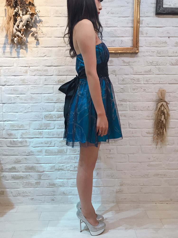 グリッターが華やかな主役級のベアドレスです。ブルーカラーのベースにシルバーのきらきらのグリッターがふんだんに散りばめられた1着です。動くたびにちらちらと輝くグリッターで主役級のデザインです。光沢のあるサテン地のウエストのリボンは後ろで結ぶタイプ。リボンの長さはしっかりとあるので大きめなリボンを作れます。お食事会や各種パーティー、謝恩会などにおすすめの1着です。結婚式参列などお呼ばれシーンにはボレロやストールなどを羽織ると露出もおさえられて◎です!