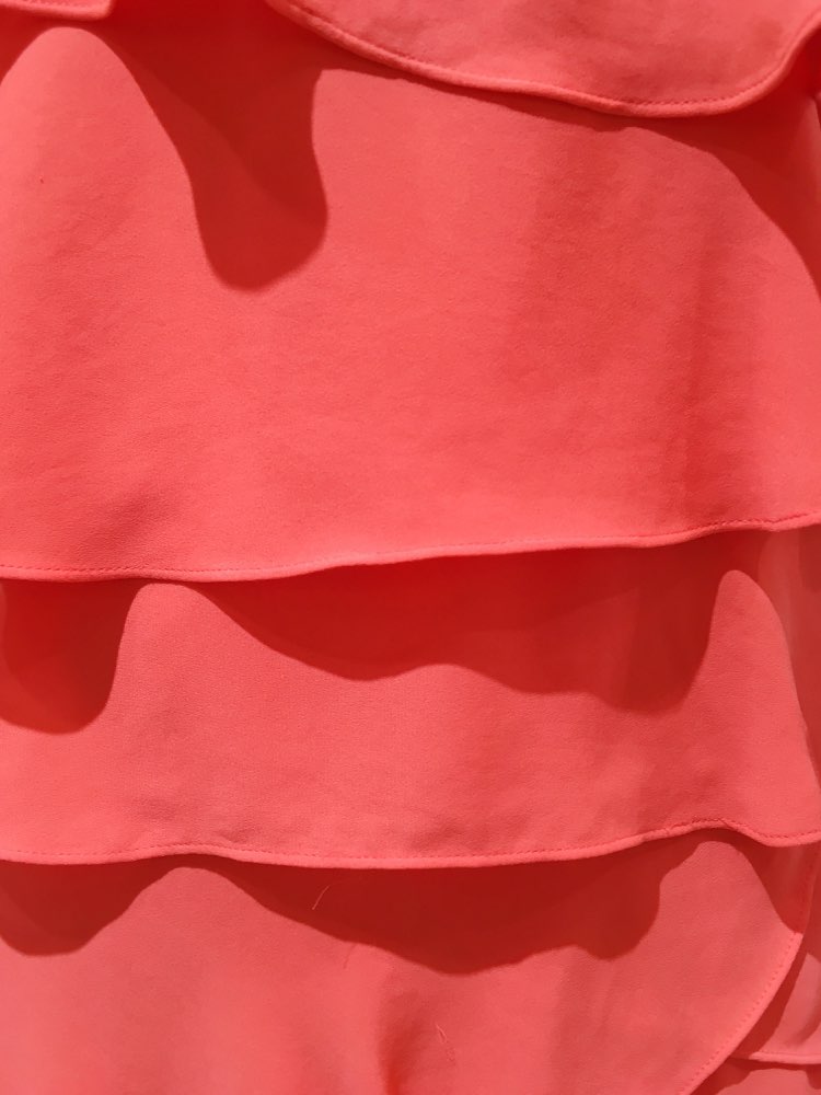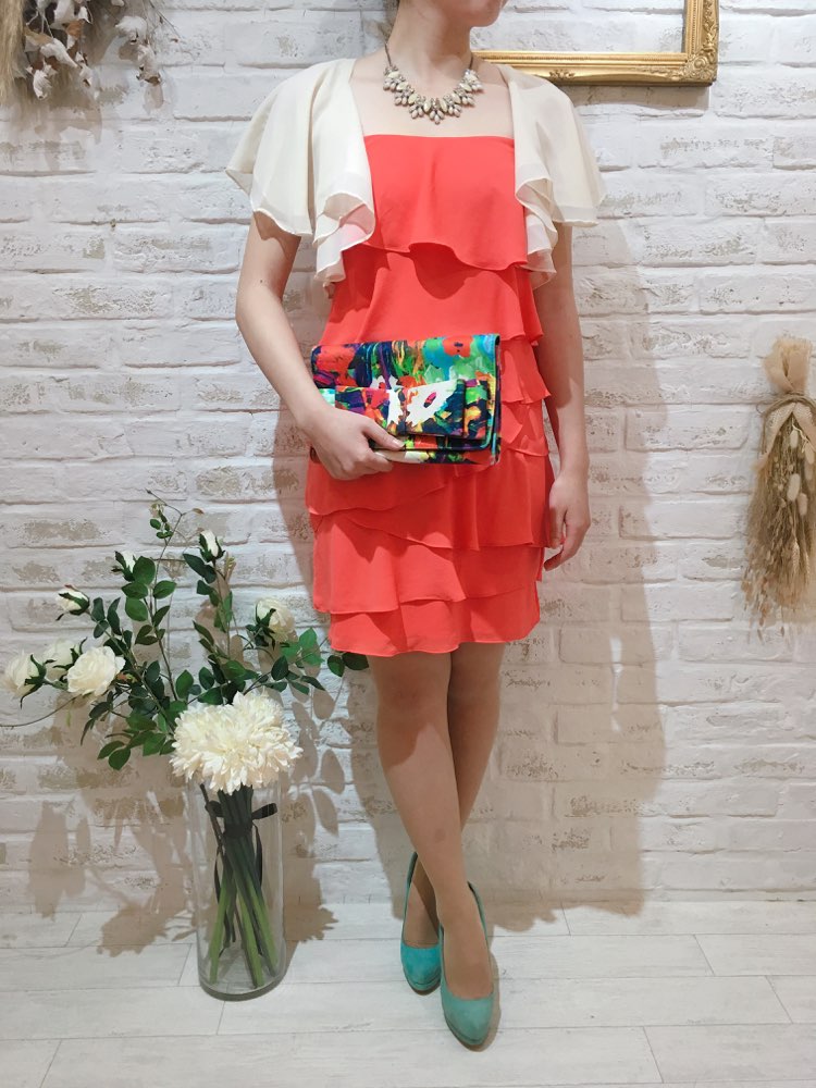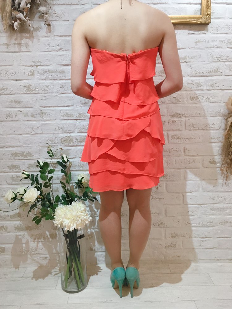 鮮やかなオレンジピンクが魅力的なティアードベアドレスです。全体的に大きめのティアードデザインになっています。生地はさらりとした透け感がないマットな素材になります。無地のドレスはのっぺり感が出やすいですが全体的に入ったティアードフリルのおかげでメリハリ感が出ます。無地でシンプルな分、バッグやシューズに柄物をコーディネートしても素敵です。お食事会や各種パーティー、謝恩会などにおすすめの1着です。結婚式参列などお呼ばれシーンにはボレロやストールなどを羽織ると露出もおさえられて◎です!