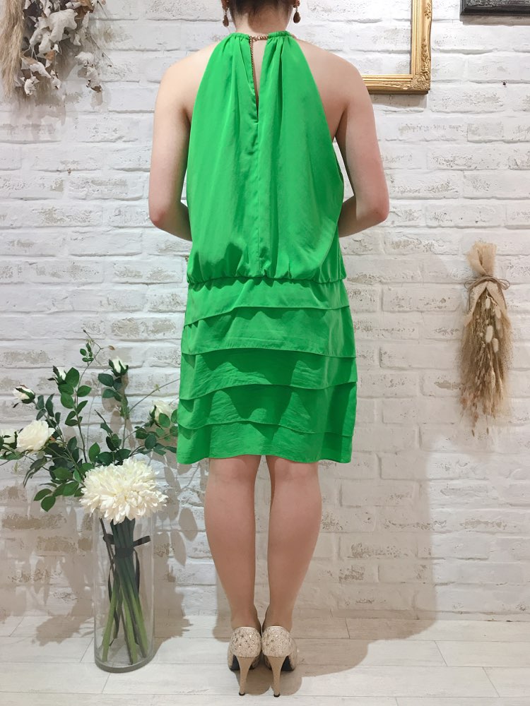 ホルターネックのグリーンカラードレスです。1年中着用いただけますが、やや黄みがかったグリーンは初夏にぴったりな爽やかでfレッシュなカラーです。ホルター部分はゴールドの金具でラグジュアリーに。スカートのティアードも魅力的です。やわらかいテロっとした素材になります。やや薄手ですが透け感はありません。お食事会や各種パーティー、謝恩会などにおすすめの1着です。結婚式参列などお呼ばれシーンにはボレロやストールなどを羽織ると露出もおさえられて◎です!