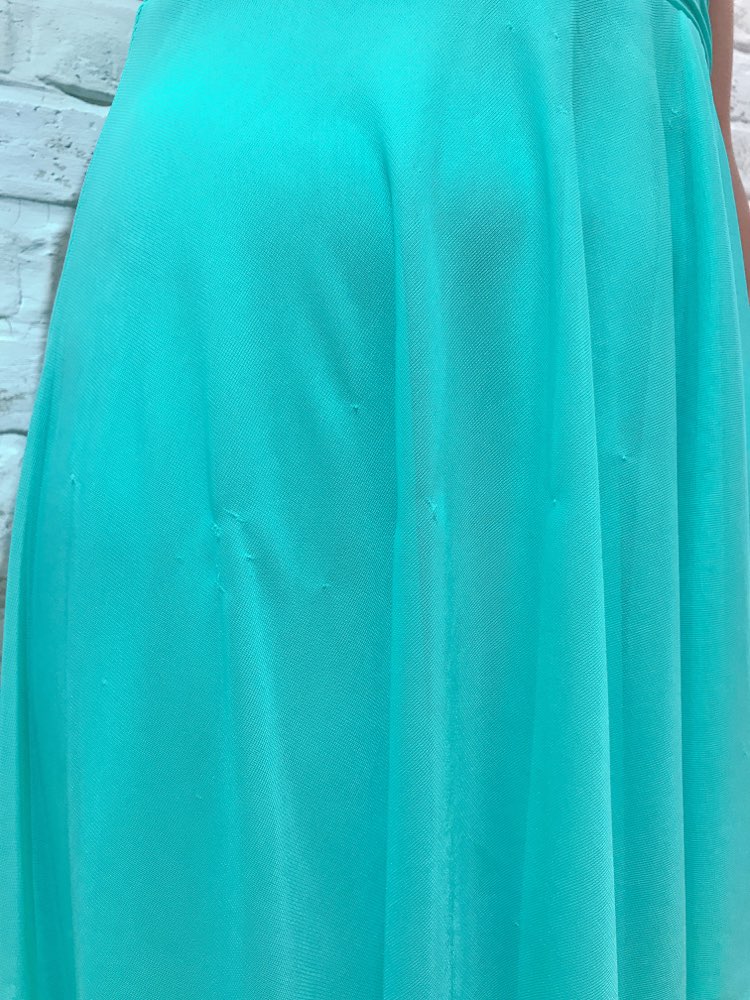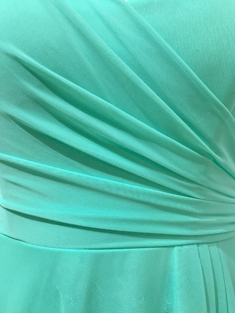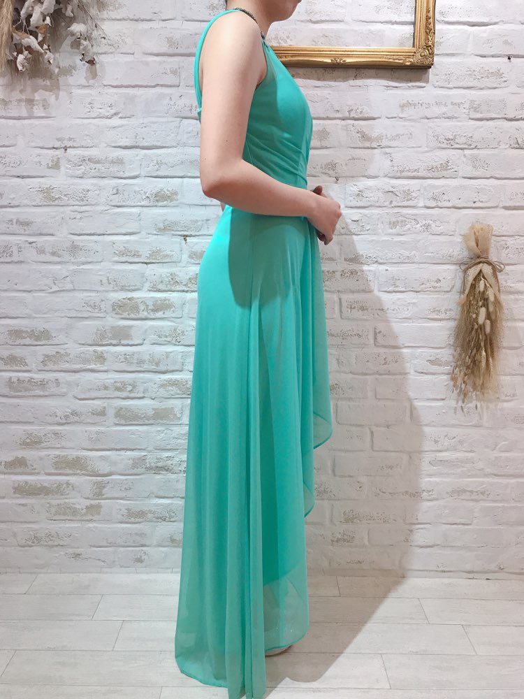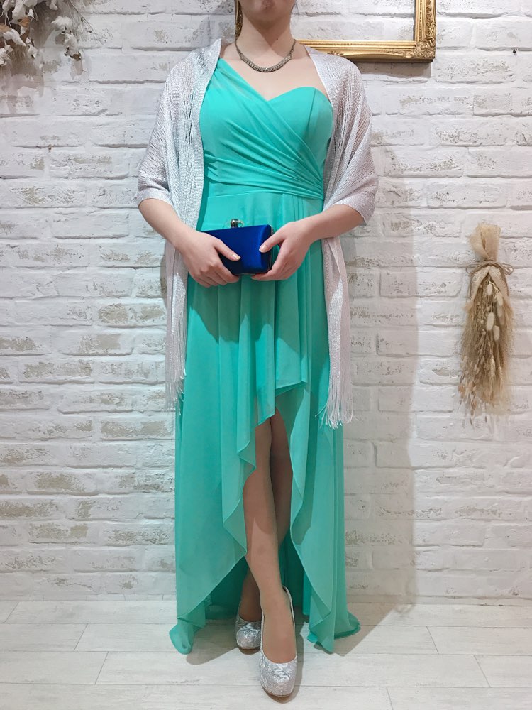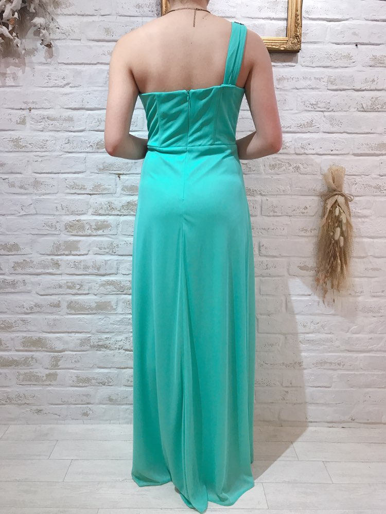 美しいグリーンカラーが魅力的なワンショルダーロングドレスです。花嫁様2次会や演奏会、華やかなパーティーシーンにおすすめの1着。ワンショルダー部分にはビジューのポイント付きでネックレスをつけなくても素敵です。イヤリング・ピアスのみのコーディネートはいかがでしょうか。若干ストレッチの入ったしっとりとした生地です。スカートは正面部分が短め、バックが眺めのイレギュラースカート。正面が短めですが脚全体が見えていないので露出が気になる方にもチェレンジしやすいデザインです。斜めラインが脚を綺麗に見せてくれます。