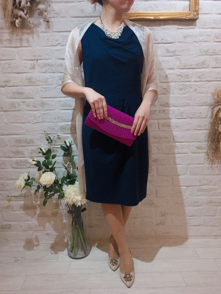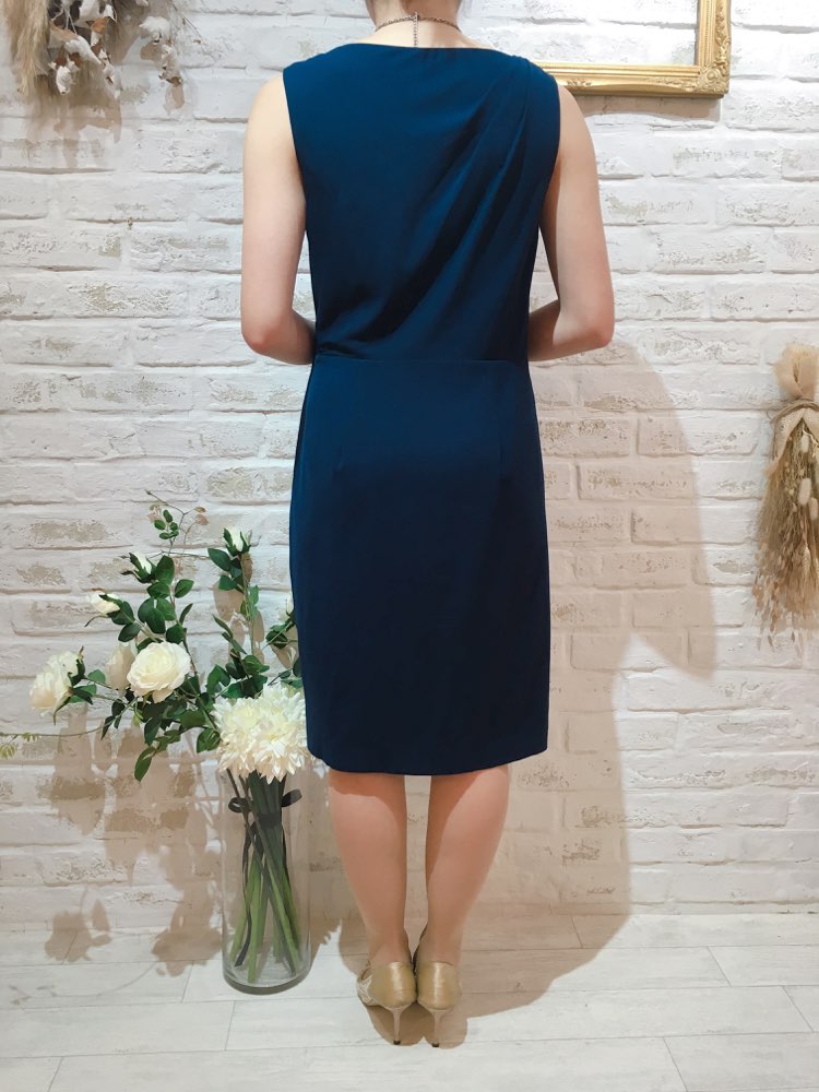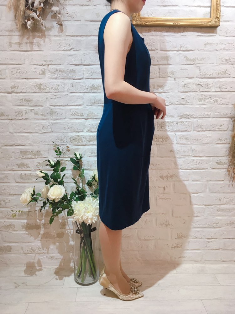 ミセスにもおすすめのシンプルネイビーノースリーブドレスです。シンプルなシルエットながらもウエストにかけてのギャザーや、首もとあたりのドレープなど細かなこだわりが身体を美しくみせてくれる1着です。大人の女性ならではのドレス。小物のコーディネート次第でいろいろな雰囲気が楽しめます。お食事会や各種パーティー、謝恩会などにおすすめの1着です。結婚式参列などお呼ばれシーンにはボレロやストールなどを羽織ると露出もおさえられて◎です!