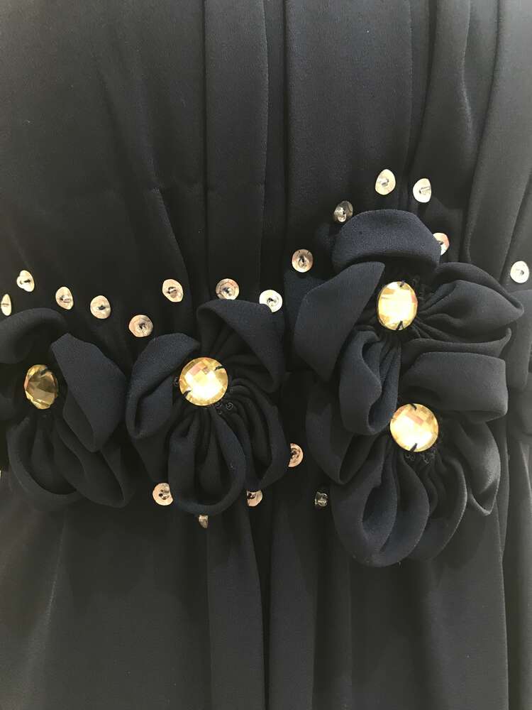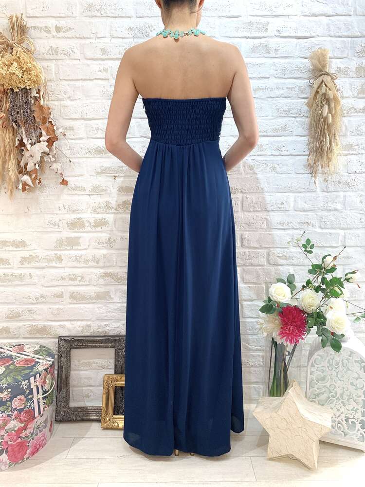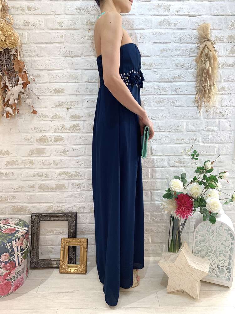 ウエスト花コサージュ付ネイビーロングベアドレス