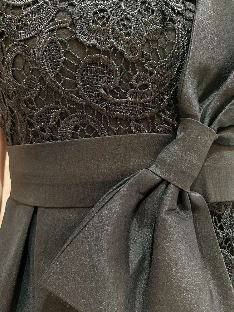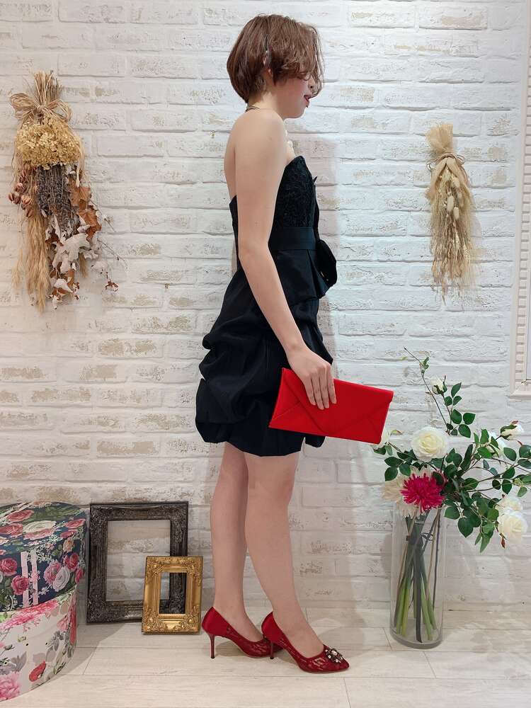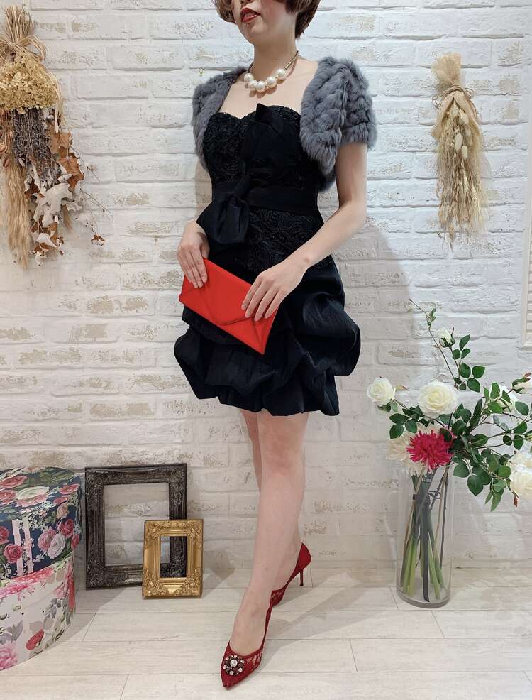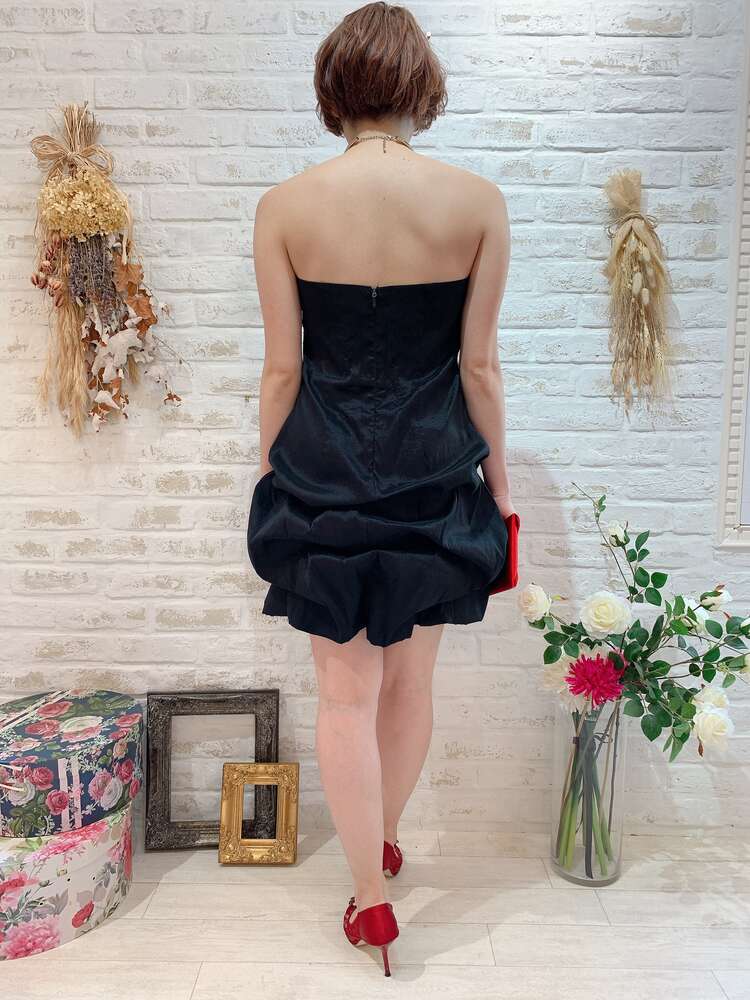 バルーンスカートリボンデザインストレッチブラックミニベアドレス