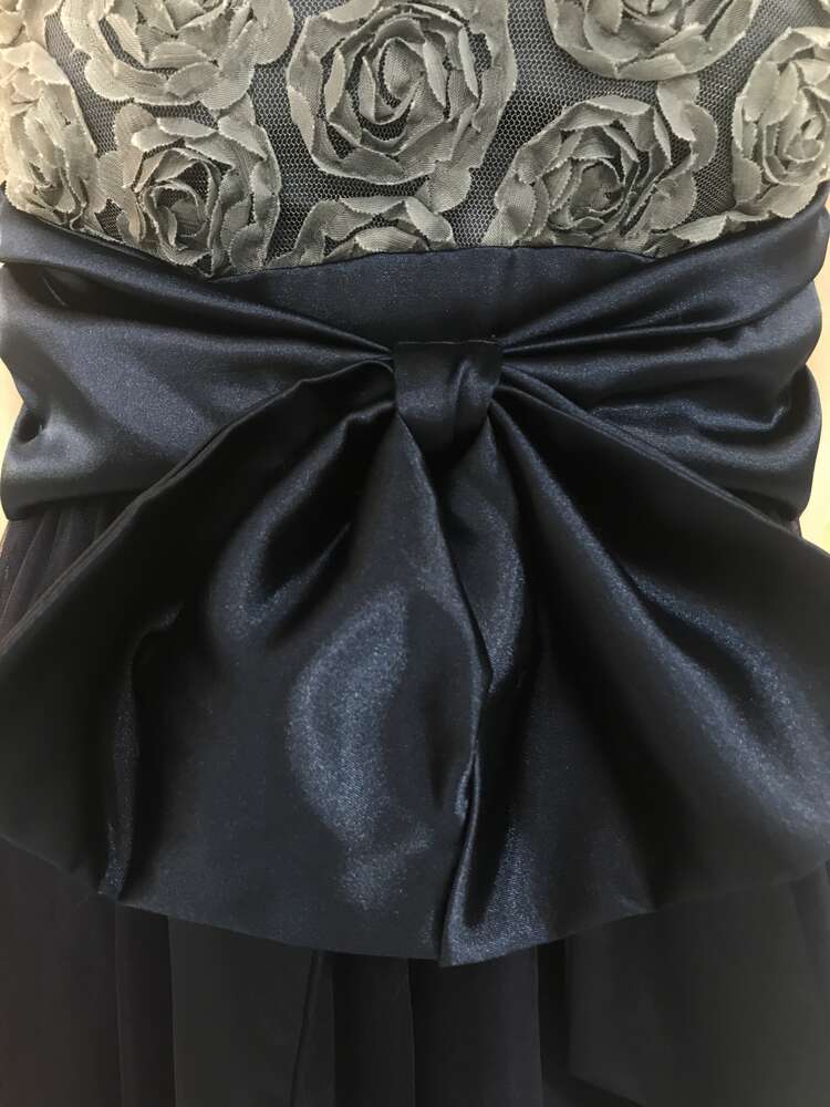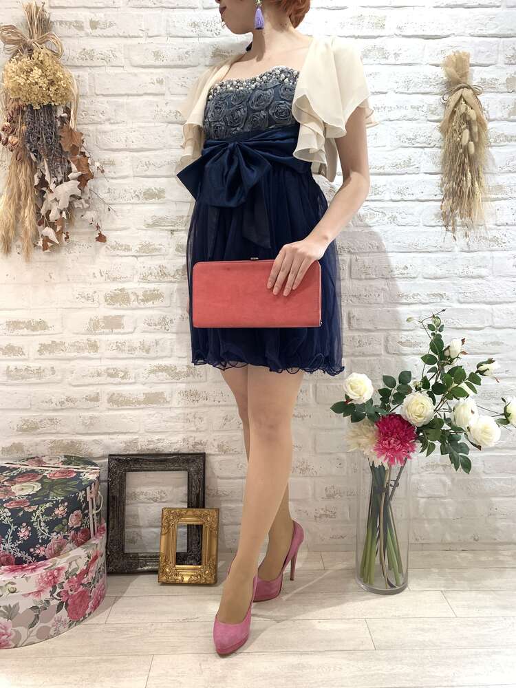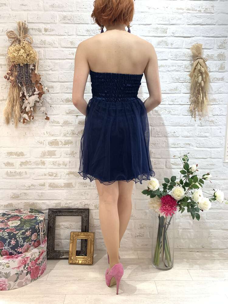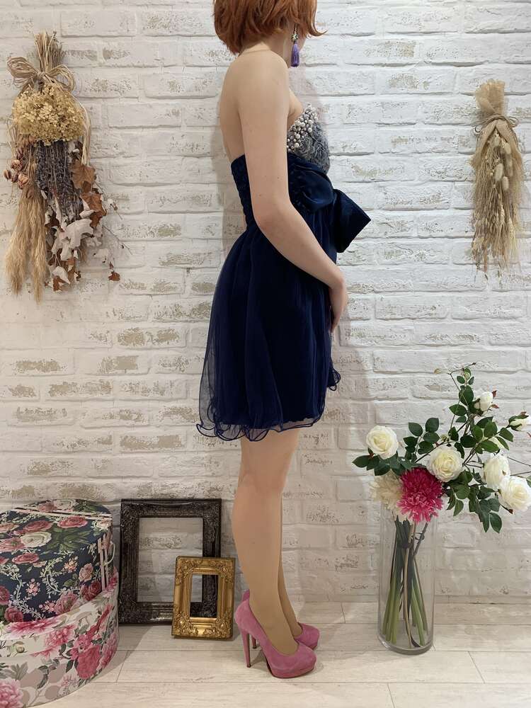 胸元バラパール付ウエストリボンベアドレス(ネイビー)