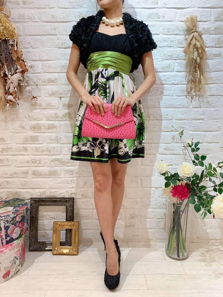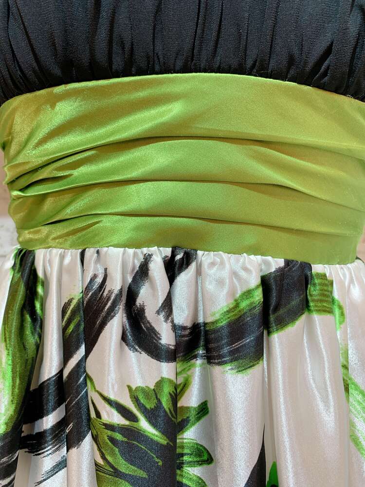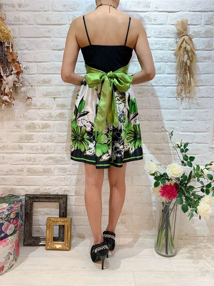 黒×白×緑光沢ウエストリボンストラップ付柄ドレス