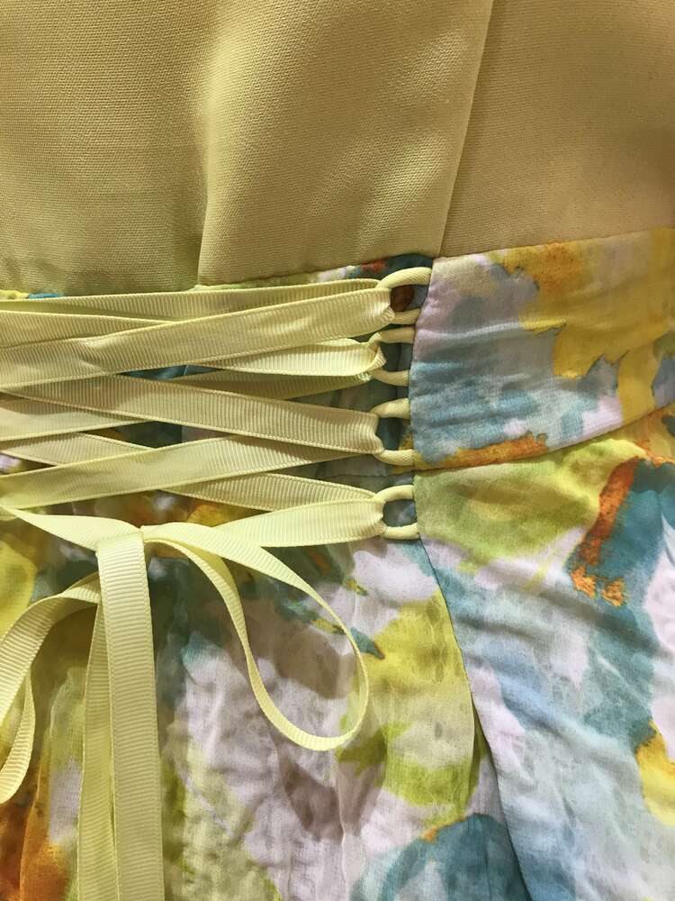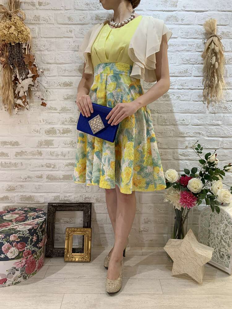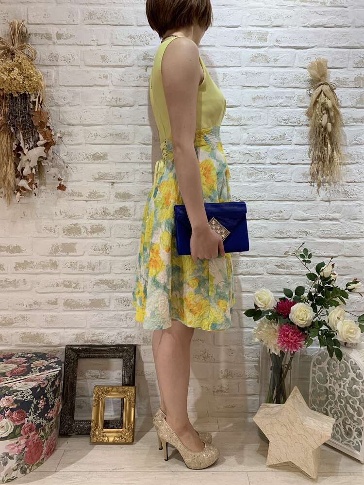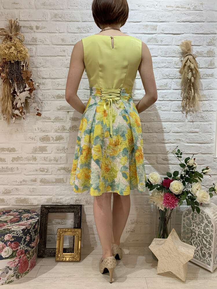 グリーン×イエロー花柄スカート後ろあみあげタンクドレス