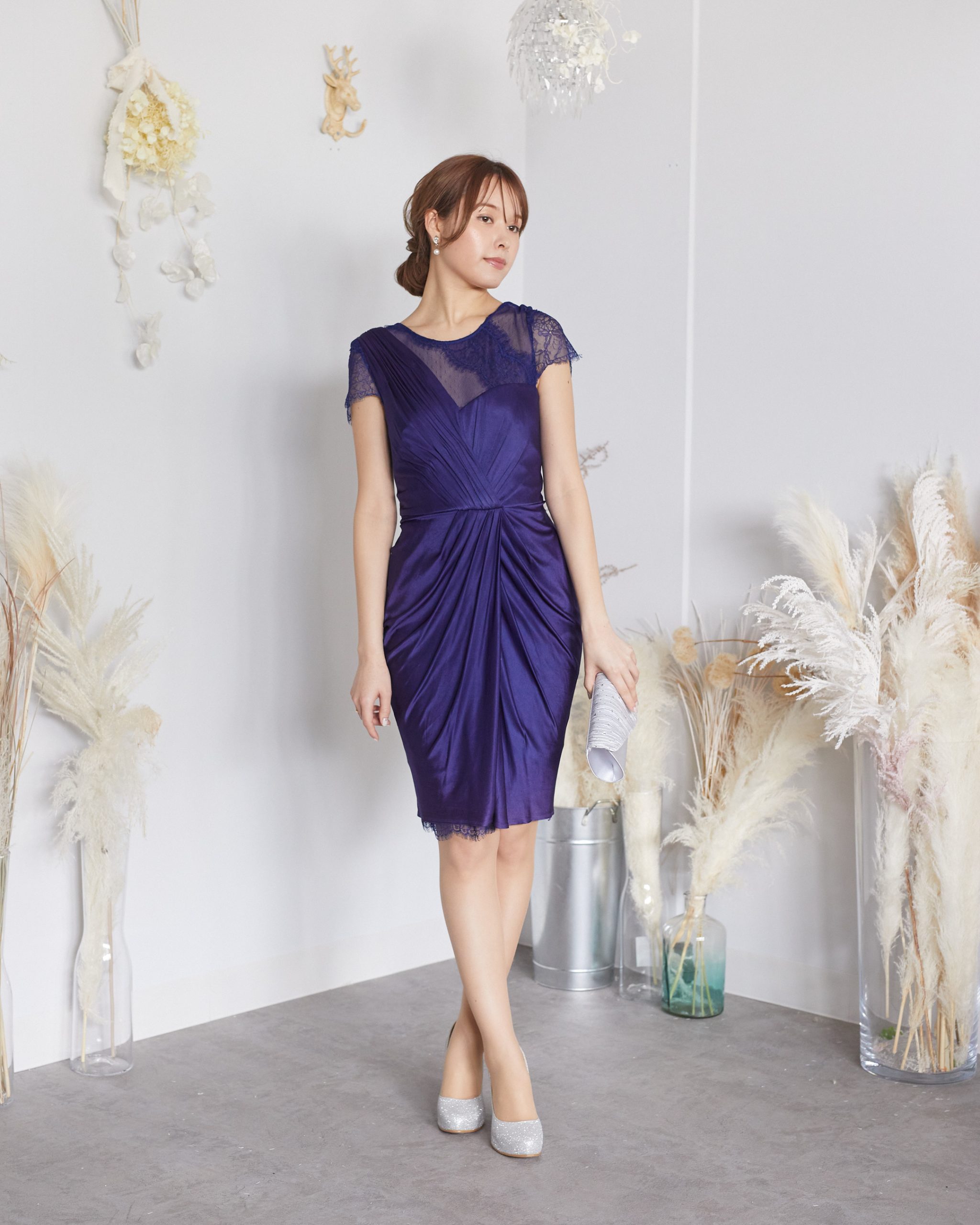 大人なネイビーブルーカラーのレースドレスです。上品さとほどよいセクシーさが手に入る1着。若干ストレッチのきいたしっとりとしたなめらかな生地です。デコルテ部分と袖部分の繊細なレースが魅力的。ドレープがきいたスカートは身体を美しく見せてくれる効果も期待できます。お食事会や女子会、デート、各種パーティー、結婚式参列におすすめのドレスです。お呼ばれシーンでも袖付きなので羽織り物無しで1枚で着て頂けます。バスト部分がやや下目にくるデザインになります。見えてもいいチューブトップや面積が少ないヌーブラ、二プレスでの着用をおすすめ致します。