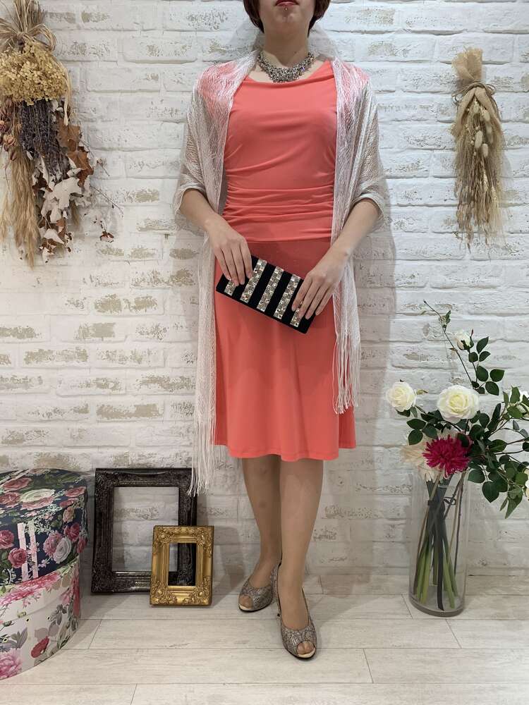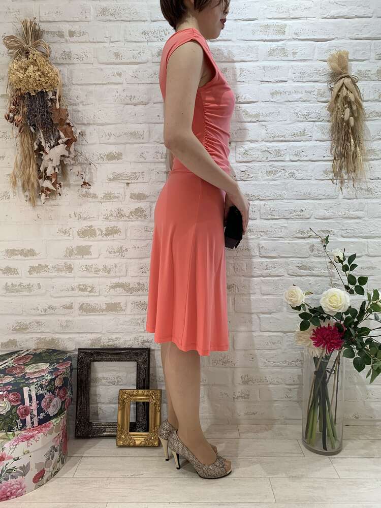 シンプルデザインのオレンジカラードレスです。上半身はややドレープがはいっており体のラインを出しすぎずにほどよくフィットしてくれるシルエット。スカートもタイトすぎず、ほどよくAラインになっており女性らしい雰囲気です。ウエストからヒップにかけてはフィットしたシルエットでヒップラインを丸く女性らしく見せてくれます。お袖はフレンチスリーブで肩は隠れますが、結婚式参列などお呼ばれシーンには、ボレロやストールなど羽織り物をプラスすると露出も抑えられて◎です。お食事会、謝恩会、各種パーティーなどにおすすめのドレスです。
