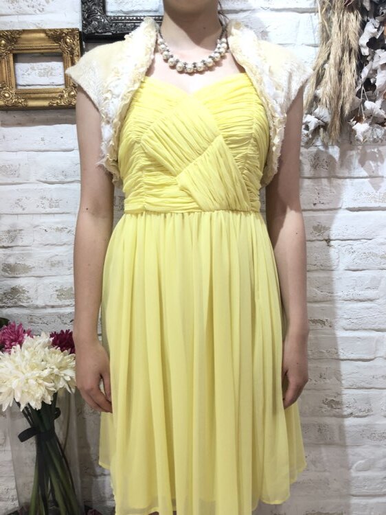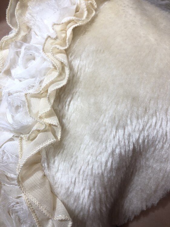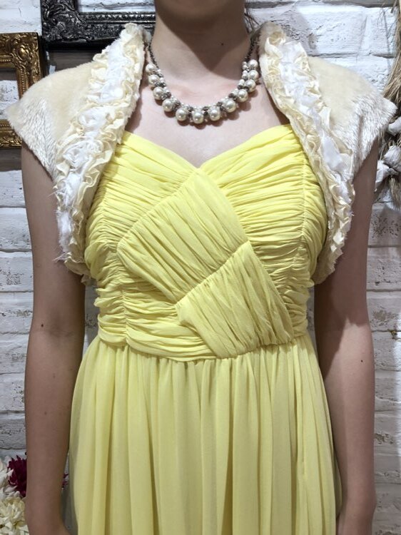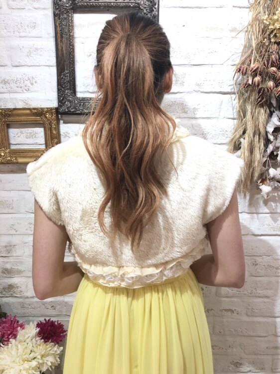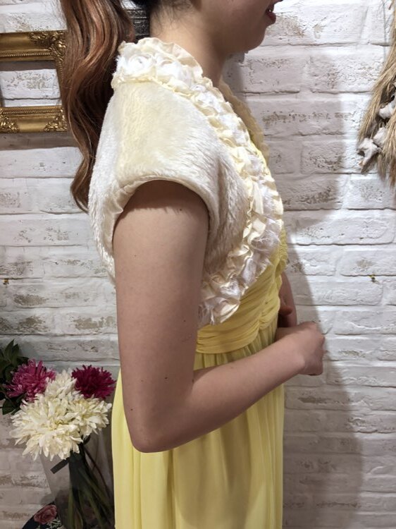 羽織るだけで華やかな雰囲気になるバラモチーフフリル付きフェイクファーボレロです。優しいクリームカラーはどんなドレスの色味ともあわせやすい1着です。フレンチスリーブはキュートな雰囲気を出してくれて華やかなドレスにも相性◎のデザインになります。クリスマスパーティーや謝恩会、成人式、お食事会、女子会など秋冬の華やかなパーティシーンにおすすめです。サイズは目安になりますので必ず表記している実寸サイズをご確認ください。