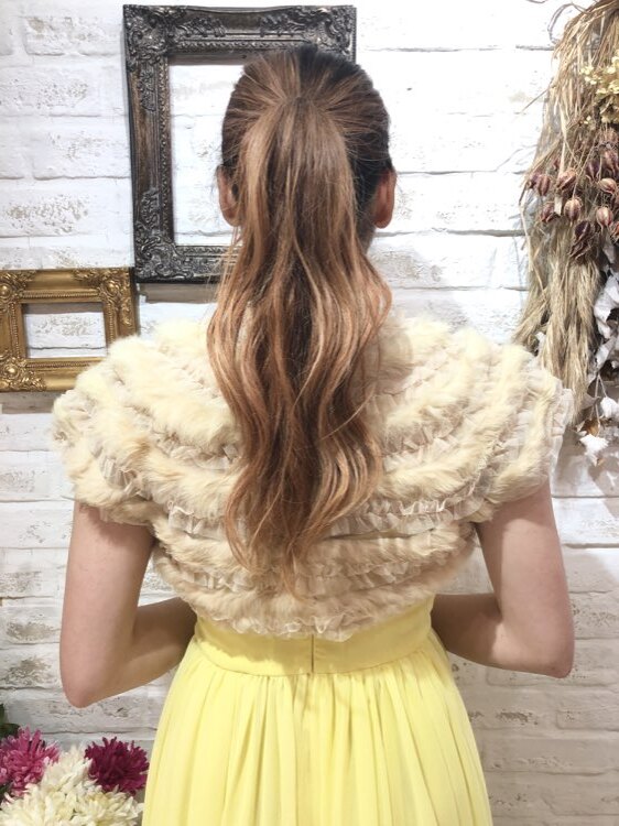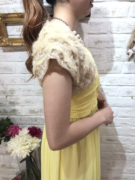 羽織るだけで華やかな雰囲気になるファー×フリルのベージュボレロです。全体的なファーデザインだとゴージャスなイメージになりがちですが、こちらのボレロはファーとフリルが交互になっていますので派手すぎずカジュアルにもきれいめにもあわせやすい1着です。クリスマスパーティーや謝恩会、成人式、お食事会、女子会など秋冬の華やかなパーティシーンにおすすめです。サイズは目安になりますので必ず表記している実寸サイズをご確認ください。