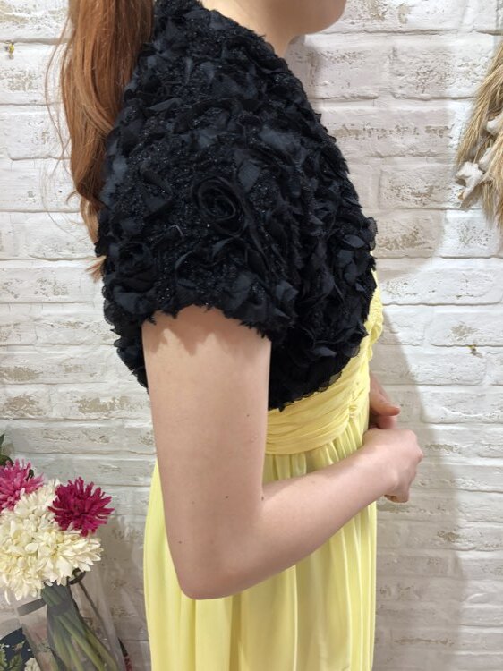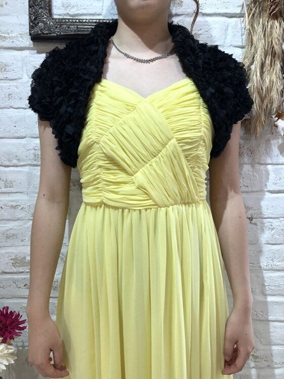 羽織るだけで華やかな雰囲気になるブラックフェイクファーボレロです。花びらのようなフリルとファーが折り重なったボレロです。ふわっとしたデザインですがブラックなので甘すぎずクール系のドレスとも相性◎です。ショート丈なので全体をすっきりと見せてくれる効果が期待できます。クリスマスパーティーや謝恩会、成人式、お食事会、女子会など秋冬の華やかなパーティシーンにおすすめです。サイズは目安になりますので必ず表記している実寸サイズをご確認ください。