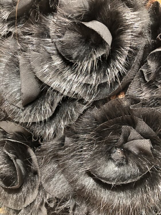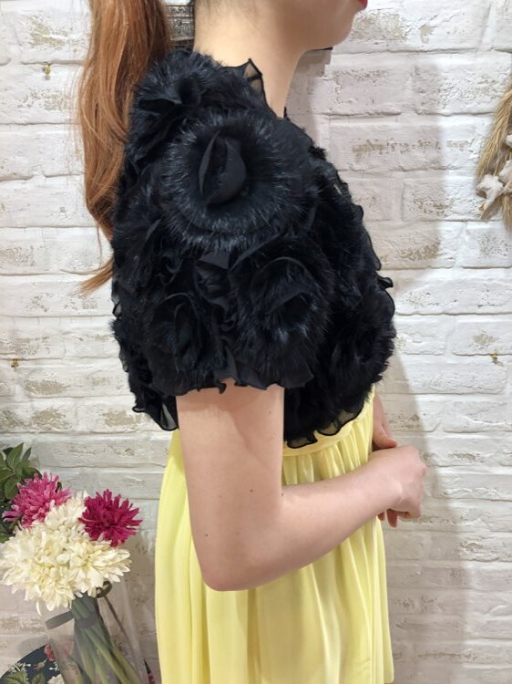 羽織るだけで華やかな雰囲気になるブラックリアルファーボレロです。花びら風のフリルとラビットファーが重なり合ったデザイン。ゴージャスで華やかなイメージの1着です。9号~13号位の方におすすめです。クリスマスパーティーや謝恩会、成人式、お食事会、女子会など秋冬の華やかなパーティシーンにおすすめです。サイズは目安になりますので必ず表記している実寸サイズをご確認ください。