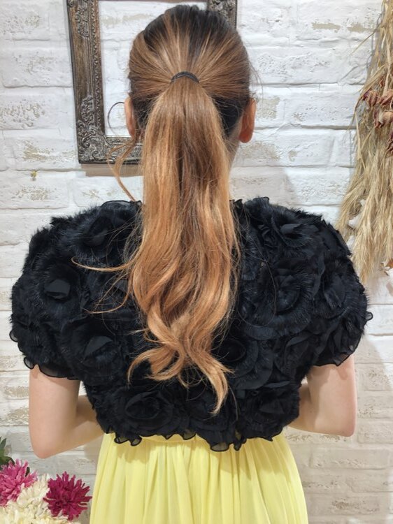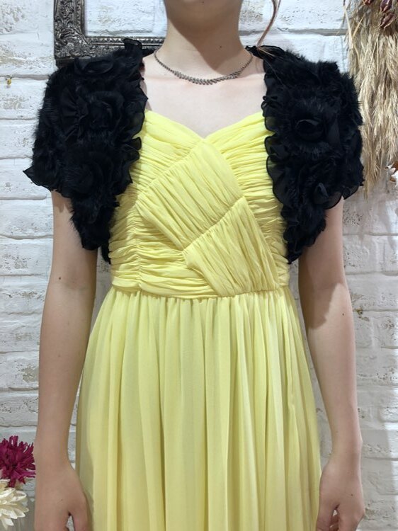 羽織るだけで華やかな雰囲気になるブラックリアルファーボレロです。花びら風のフリルとラビットファーが重なり合ったデザイン。ゴージャスで華やかなイメージの1着です。9号~13号位の方におすすめです。クリスマスパーティーや謝恩会、成人式、お食事会、女子会など秋冬の華やかなパーティシーンにおすすめです。サイズは目安になりますので必ず表記している実寸サイズをご確認ください。