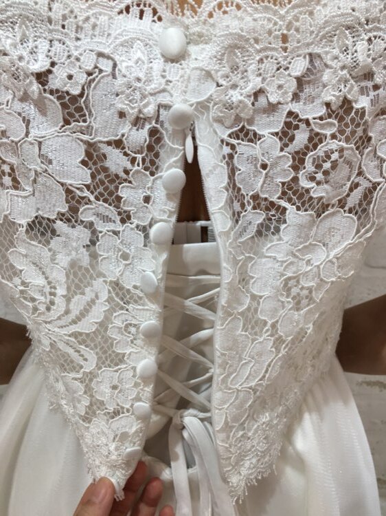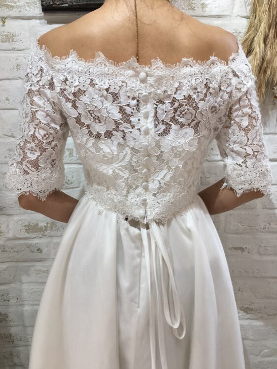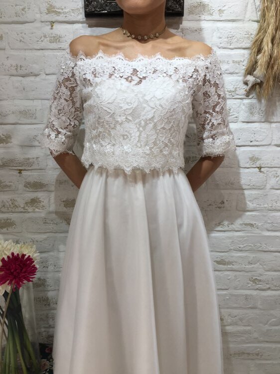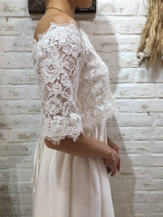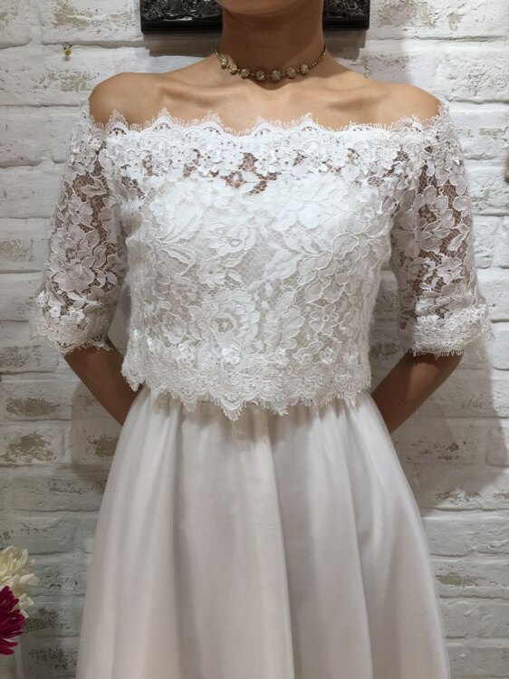 花嫁様におすすめのホワイトウェディングボレロです。背中部分はファスナータイプ。ホワイトカラーのシンプルめなベアドレスの上に羽織るだけでドレスの雰囲気をがらりと変えることが可能です。総レースで清楚で上品なイメージに。腕をすっきりと見せてくれる5分袖丈。二の腕を露出されたくない方にもおすすめです。オフショルダーデザイン。サイズは目安になりますので必ず表記している実寸サイズをご確認ください。