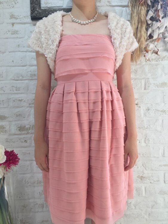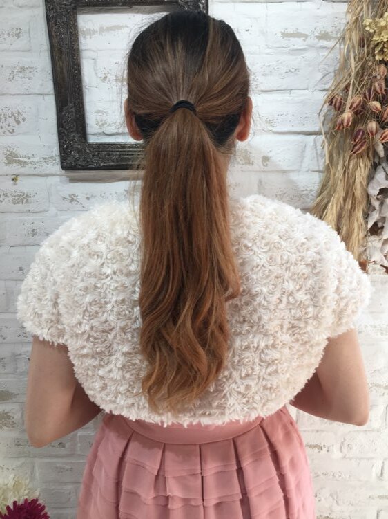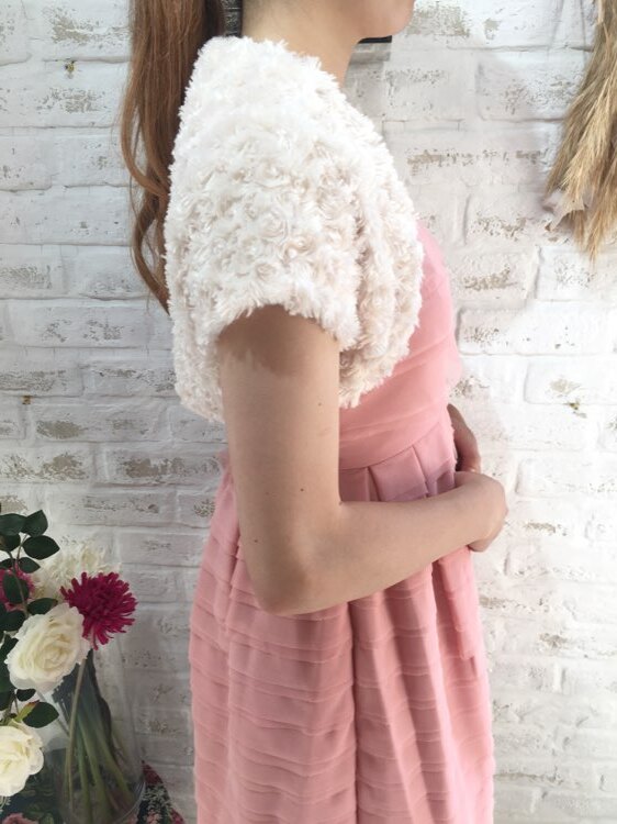 羽織るだけで華やかな雰囲気になるクリームカラーのフェイクファーボレロです。カールしたような毛並みが可愛らしい1着。厚すぎない生地なので着ぶくれすることなくファーボレロでもすっきりと着こなせます。クリスマスパーティーや謝恩会、成人式、お食事会、女子会など秋冬の華やかなパーティシーンにおすすめです。M~Lサイズ位の方にお勧め。サイズは目安になりますので必ず表記している実寸サイズをご確認ください。