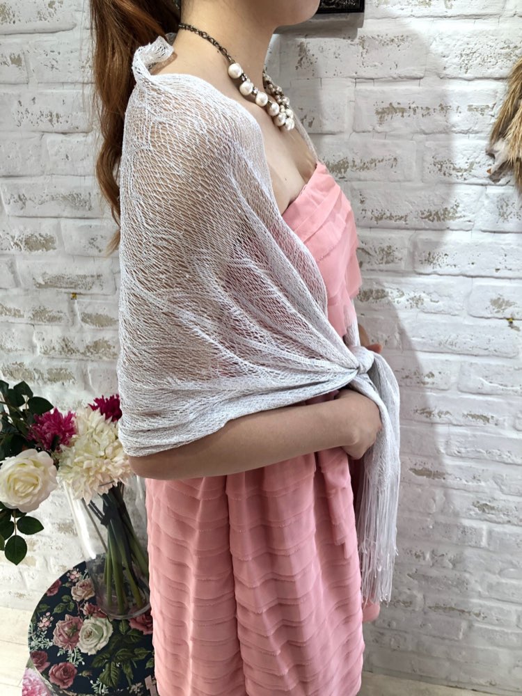 当店定番人気のフリンジ付きストールです。柔らかな素材とシンプルなデザインはさりげなく羽織れるので、こなれ感があり、野暮ったくならずに今っぽい雰囲気にしてくれます。また透け感もあるのでコーディネートの邪魔にならず軽やかなイメージ。どんなデザインのドレスにもあわせやすいのは無駄のないシンプルなデザインのおかげです。派手すぎないほのかなラメ感が入っているのでほどよいパーティ感も演出してくれます。