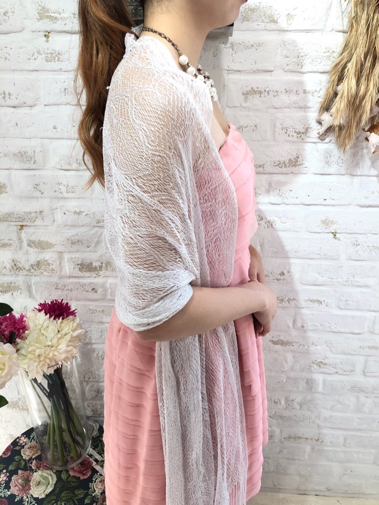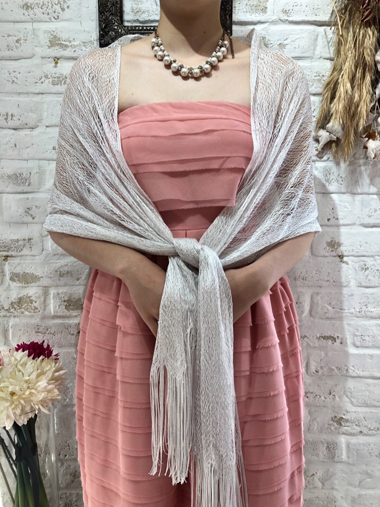 当店定番人気のフリンジ付きストールです。柔らかな素材とシンプルなデザインはさりげなく羽織れるので、こなれ感があり、野暮ったくならずに今っぽい雰囲気にしてくれます。また透け感もあるのでコーディネートの邪魔にならず軽やかなイメージ。どんなデザインのドレスにもあわせやすいのは無駄のないシンプルなデザインのおかげです。派手すぎないほのかなラメ感が入っているのでほどよいパーティ感も演出してくれます。