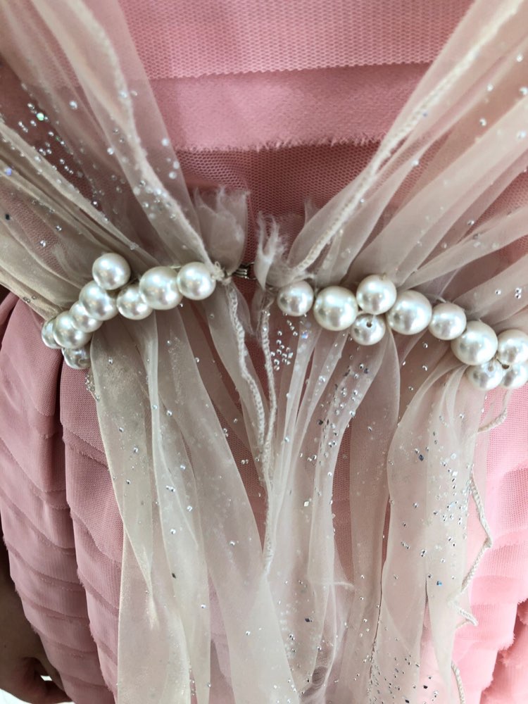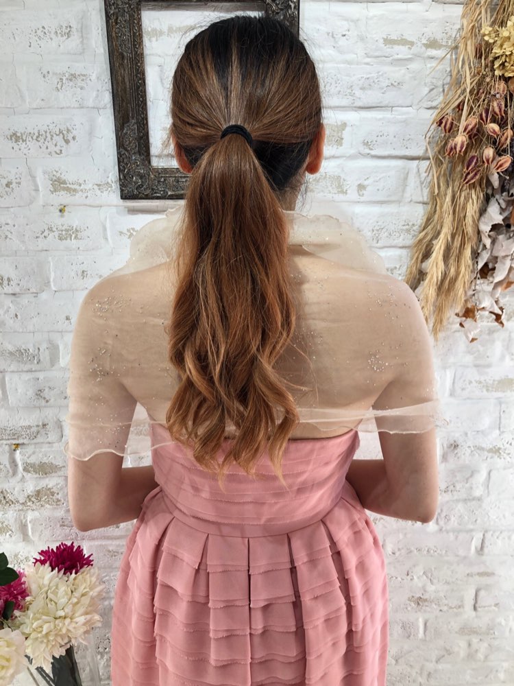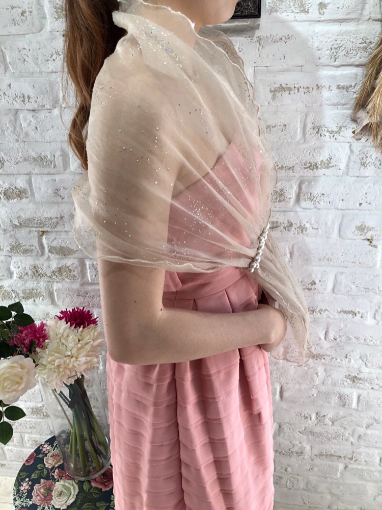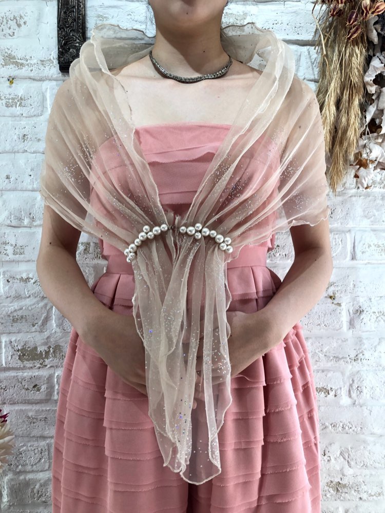 ハリ感のあるポイントパール付きベージュストールです。ドレスに羽織るだけでワンランク格上げしてくれる1点になります。パールの裏面に正面で留められるホック付き。ハリ感のある素材は上品で気品がある印象を与えてくれます。結婚式参列や謝恩会、成人式、各種パーティなどに1点プラスしてみてはいかがでしょうか。