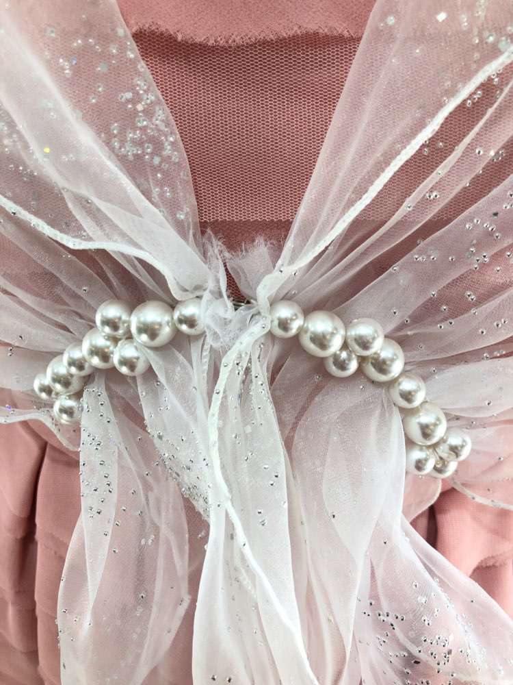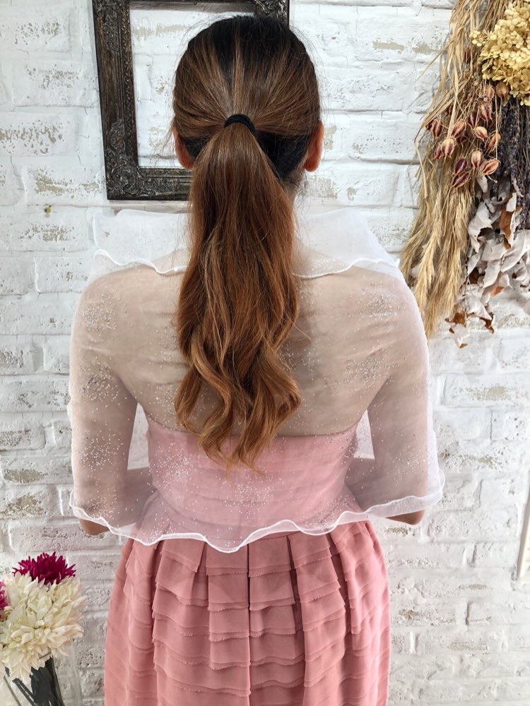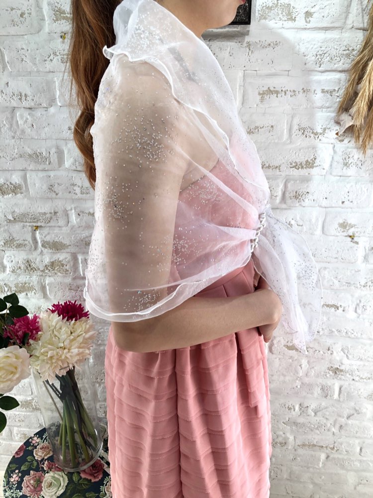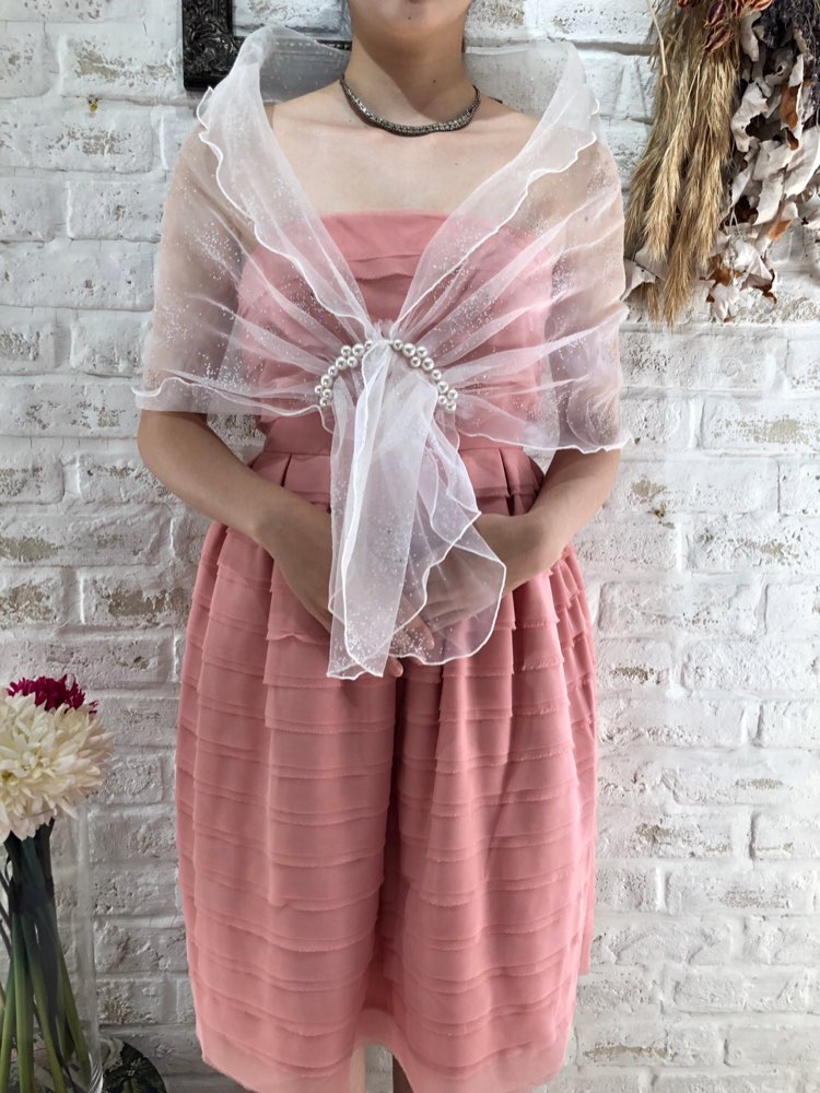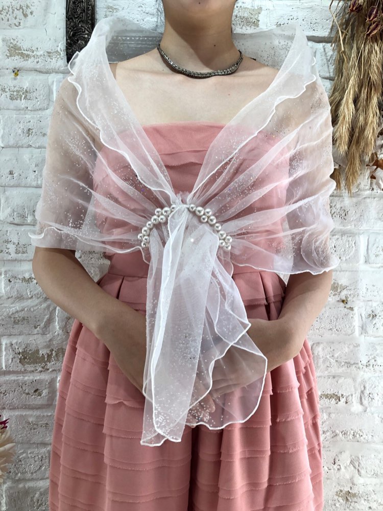 ハリ感のあるポイントパール付きホワイトストールです。ドレスに羽織るだけでワンランク格上げしてくれる1点になります。パールの裏面に正面で留められるホック付き。ハリ感のある素材は上品で気品がある印象を与えてくれます。結婚式参列や謝恩会、成人式、各種パーティなどに1点プラスしてみてはいかがでしょうか。