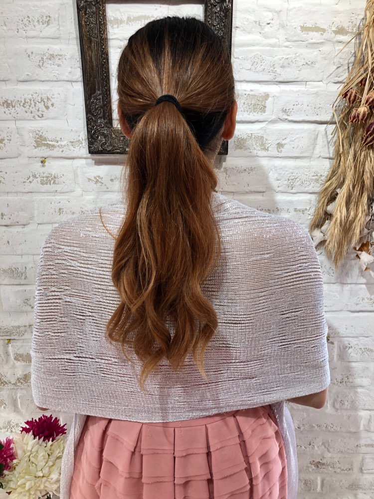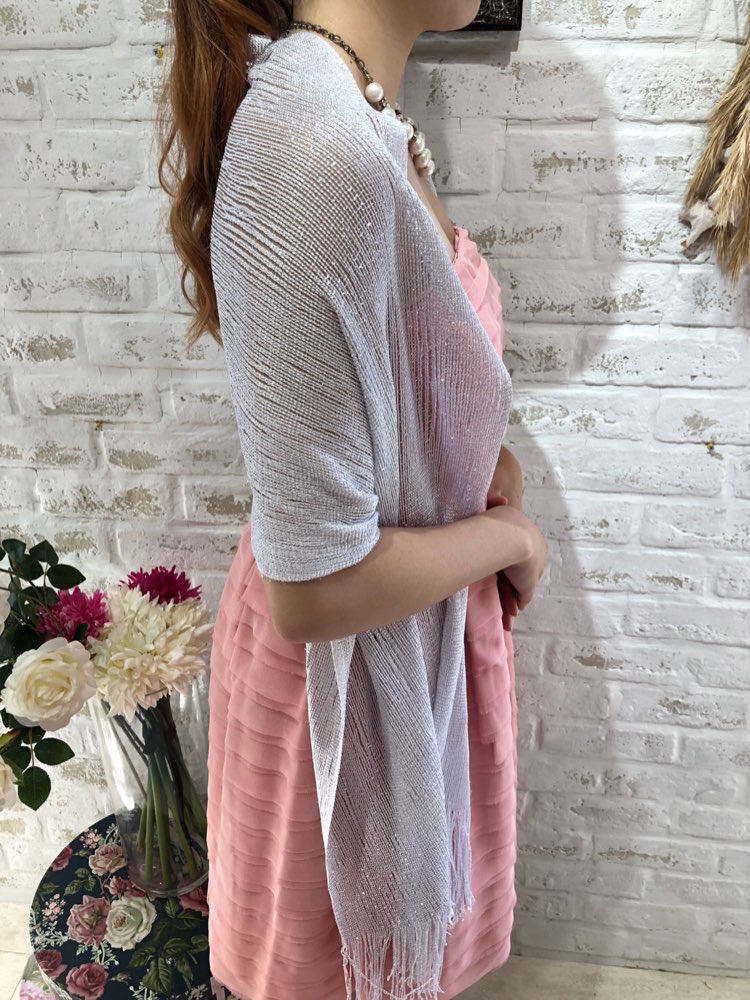 ラメ糸が輝くフリンジ付きストールです。ややハリ感のある素材とシンプルなデザインは上品で気品のあるコーディネートに仕上げてくれます。また透け感もあるのでコーディネートの邪魔にならず軽やかなイメージ。どんなデザインのドレスにもあわせやすいのは無駄のないシンプルなデザインのおかげです。生地にラメ糸が入っているので華やかな雰囲気に演出してくれます。