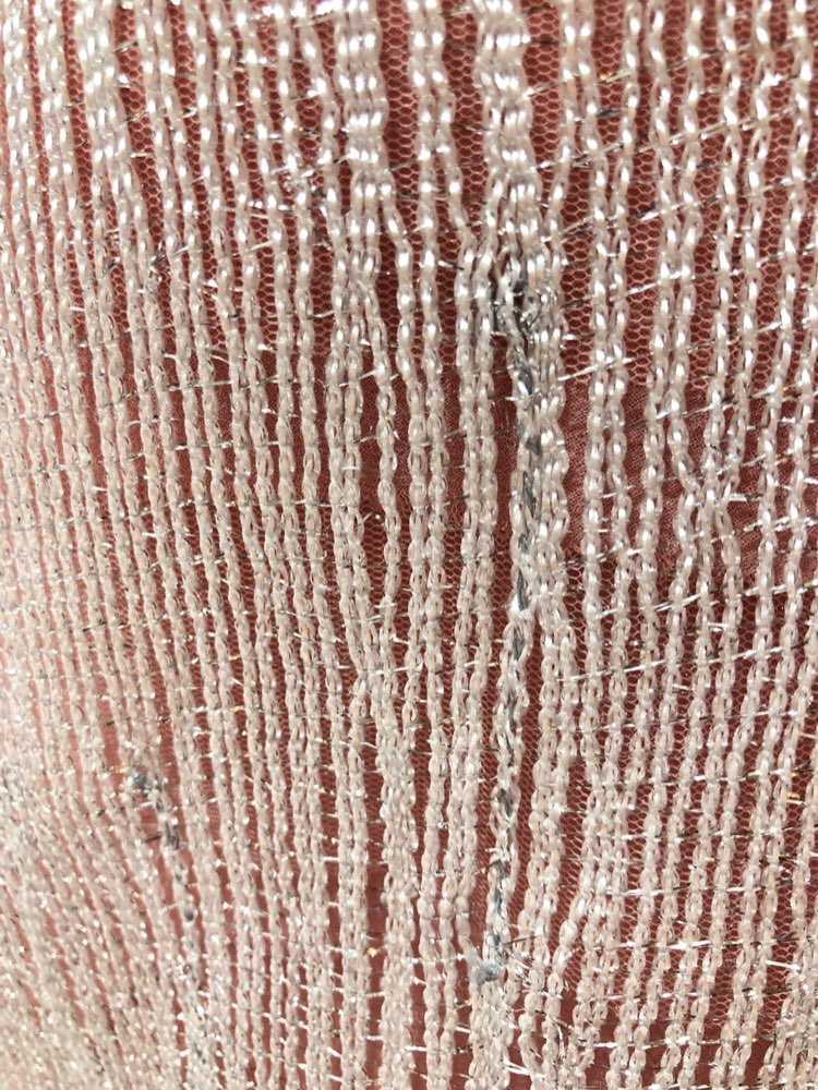細かいラメ入りのレース状にあまれた軽い素材です。お顔を明るく見せてくれるホワイトシルバーカラー。