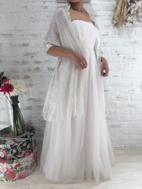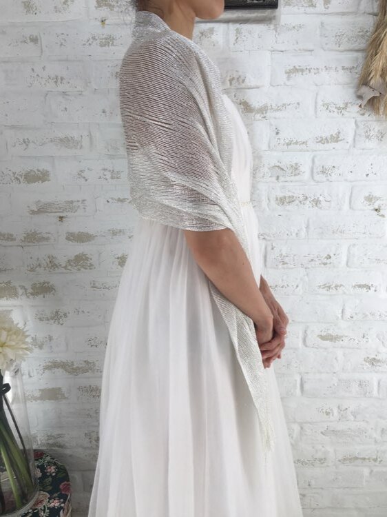 ラメ糸が輝くフリンジ付きストールです。ややハリ感のある素材とシンプルなデザインは上品で気品のあるコーディネートに仕上げてくれます。また透け感もあるのでコーディネートの邪魔にならず軽やかなイメージ。どんなデザインのドレスにもあわせやすいのは無駄のないシンプルなデザインのおかげです。生地にラメ糸が入っているので華やかな雰囲気に演出してくれます。