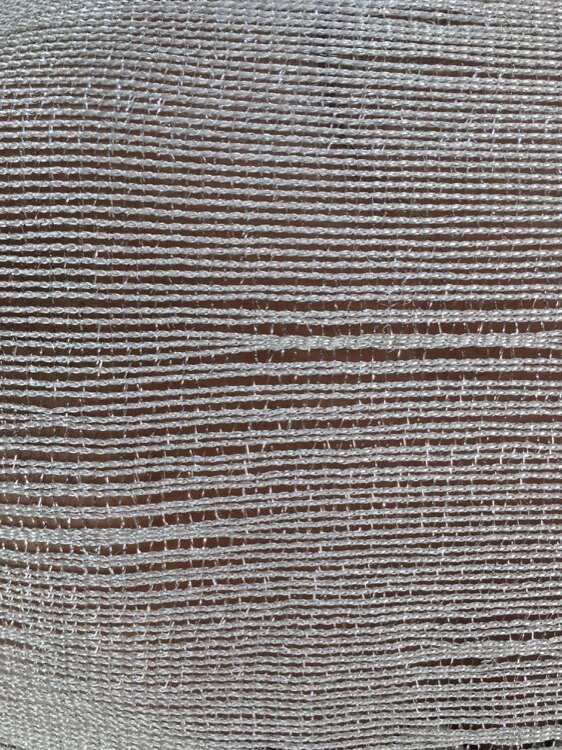 細かいラメ入りのレース状にあまれた軽い素材です。お顔を明るく見せてくれるホワイトシルバーカラー。