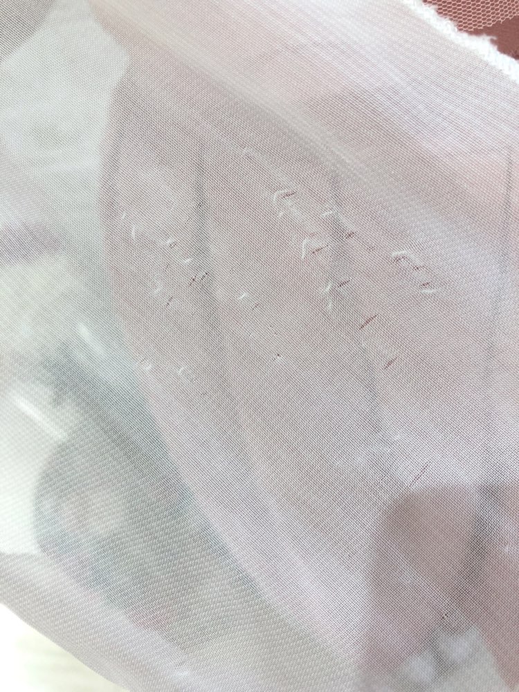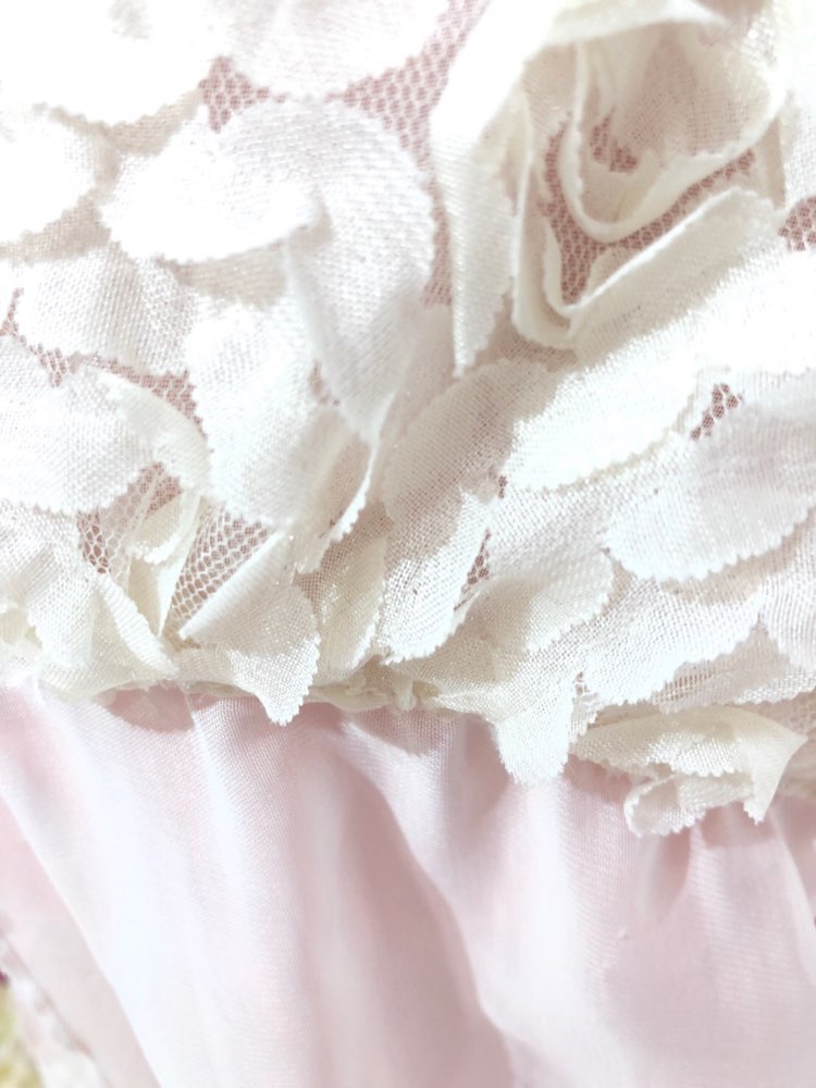 透け感、光沢感のないマットな質感のフリルです。リボン部分はやや光沢がありさらりとした手触りの柔らかい生地を使用しております。