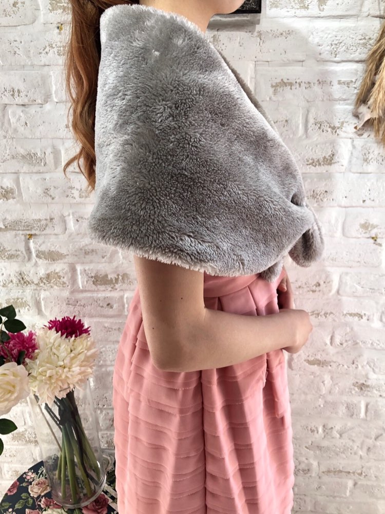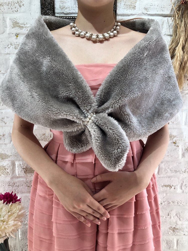 1点プラスするだけで華やかになるグレーフェイクファーケープです。正面でとめられるスナップボタン付き。交差する位置のパールがポイントになっています。上品エレガントなグレーカラー。毛足が短いのでゴージャスになりすぎず、カジュアルめなコーディネートにもあわせやすい1点です。クリスマスパーティーや謝恩会、成人式、お食事会、女子会など秋冬の華やかなパーティシーンにおすすめです。サイズは目安になりますので必ず表記している実寸サイズをご確認ください。
