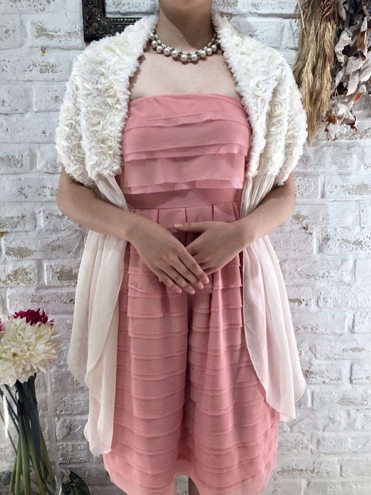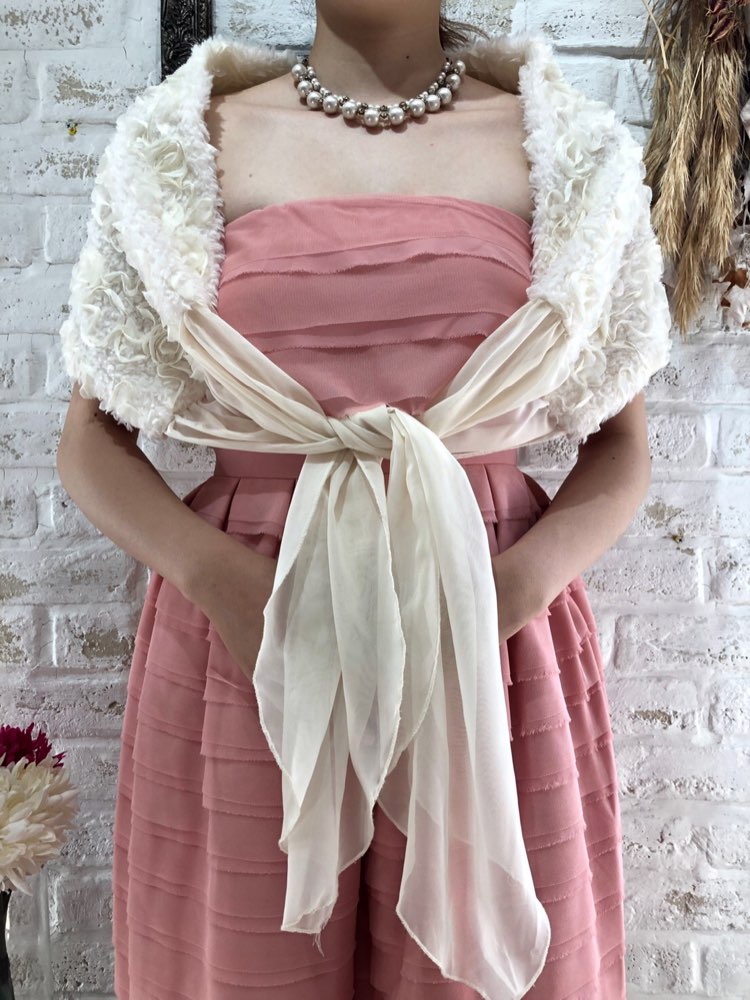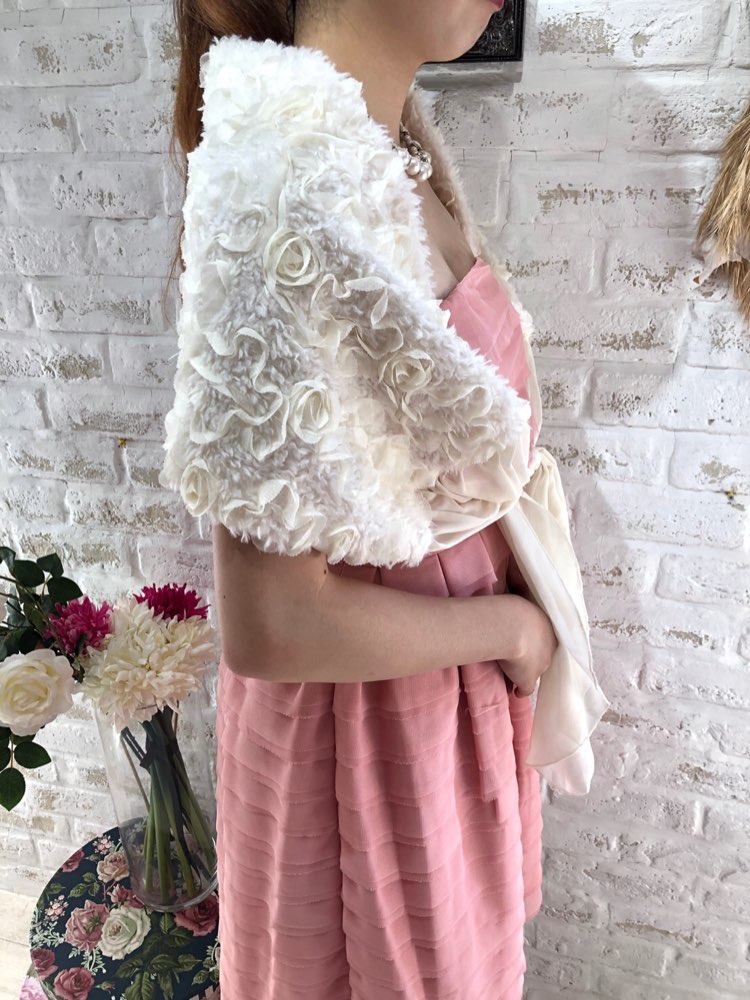 コーディネートに追加するだけでシーズンムードあふれるアイテム。花びら風デザインが華やかな雰囲気を演出してくれるフェイクファーストールです。どんなカラーのドレスにもあわせやすい柔らかみのあるアイボリーカラー。リボンを正面で結んで羽織るタイプにおなります。クリスマスパーティーや謝恩会、成人式、お食事会、女子会など秋冬の華やかなパーティシーンにおすすめです。サイズは目安になりますので必ず表記している実寸サイズをご確認ください。