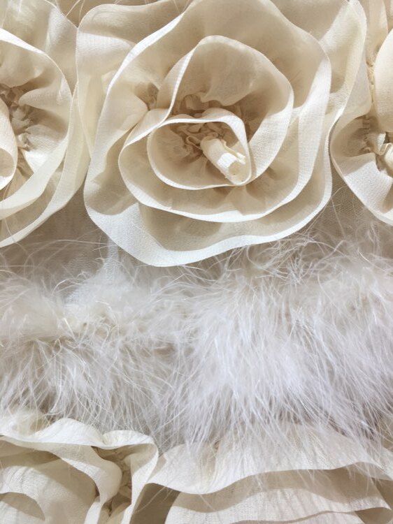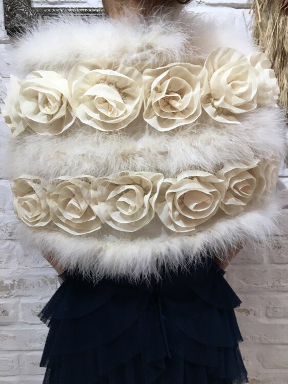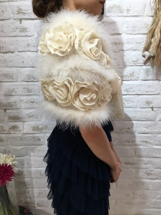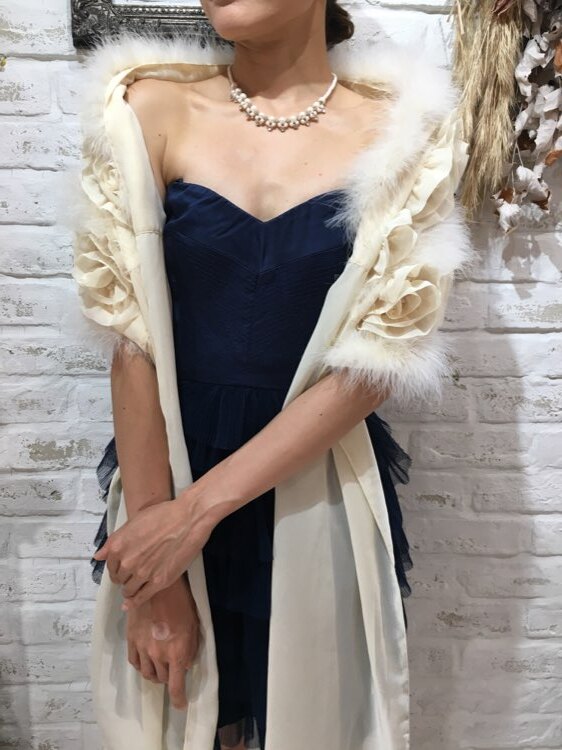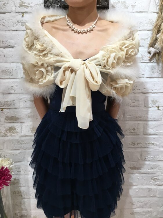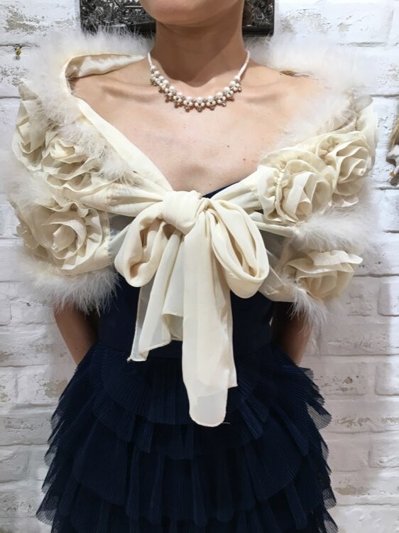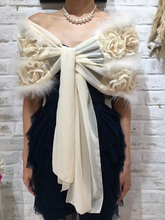花びら風フリルとリアルファーが気品あるデザインのストールです。リボン部分を結んで羽織るタイプ。20代~40代、50代と様々な年代の方におすすめの商品です。表情を明るく見せてくれる清楚なアイボリーカラー。クリスマスパーティーや謝恩会、成人式、お食事会、女子会など秋冬の華やかなパーティシーンにおすすめです。サイズは目安になりますので必ず表記している実寸サイズをご確認ください。